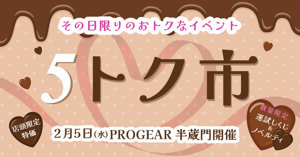 東京・半蔵門の映像制作機器専門ショールーム「PROGEAR半蔵門」限定企画として、2月5日(水)に店頭限定企画「5トク市」を開催いたします。店頭限定の特価品や中古ジャンク品ワゴンセール、運試しくじや限定ノベルティをご用意して皆様のご来店をお待ちしております。詳細は下記のご案内ページをご覧ください。