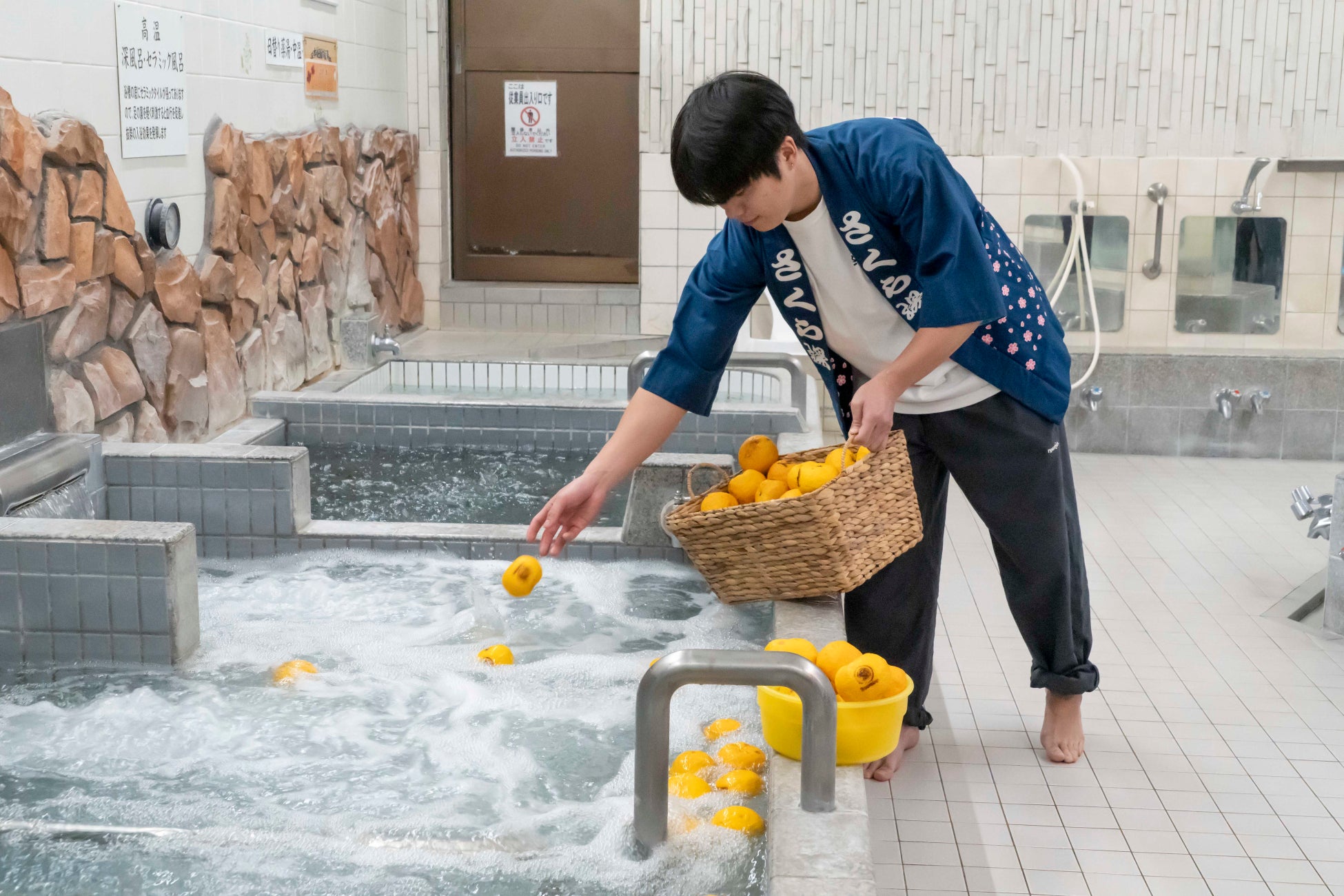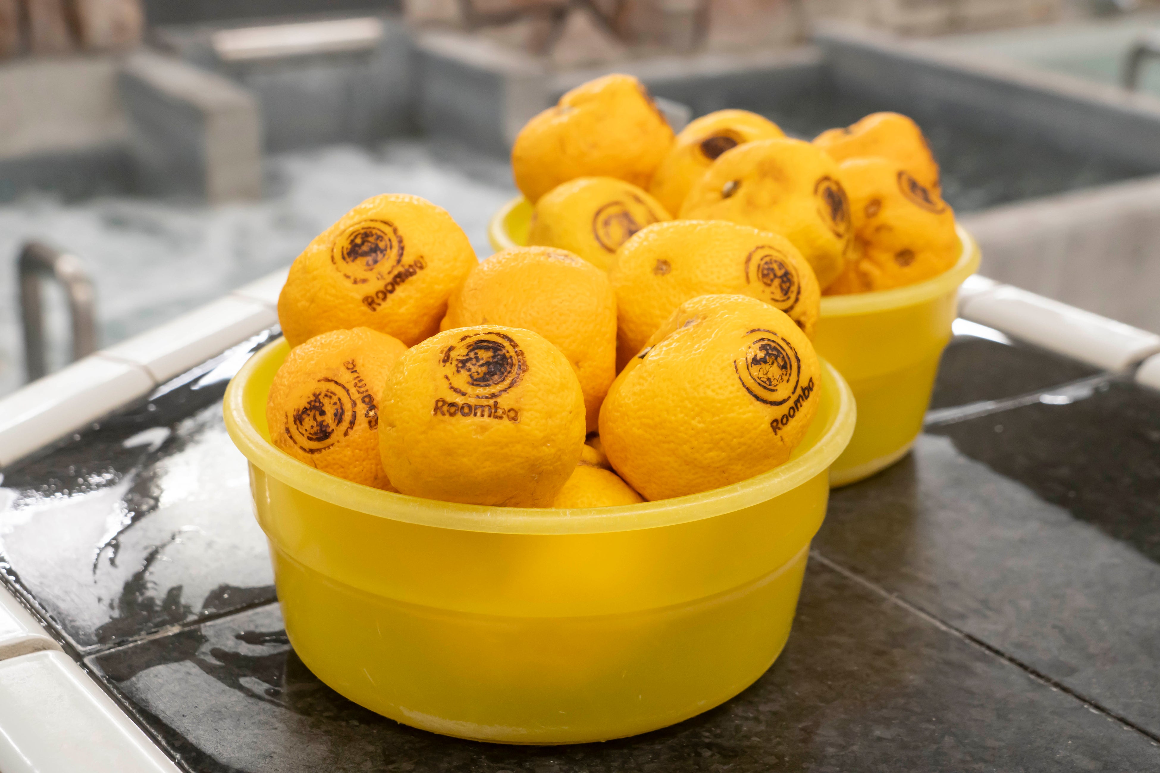 大掃除後は、毎年冬至の時期に地域の方から大好評のゆず湯を準備。今回は「ルンバのお助け大掃除プロジェクト」を記念して、ルンバの焼印を入れた“ルンバゆず”をアイロボットより贈呈しました。受け取ったさくら湯のスタッフは、大きなかごに大量に入った“ルンバゆず”を浴槽に入れ、一足早く“ルンバゆず湯”を用意しました。さくら湯では、本日19日(木)から冬至21日(土)までの3日間、“ルンバゆず湯”を一般のお客さま向けに実施予定です。