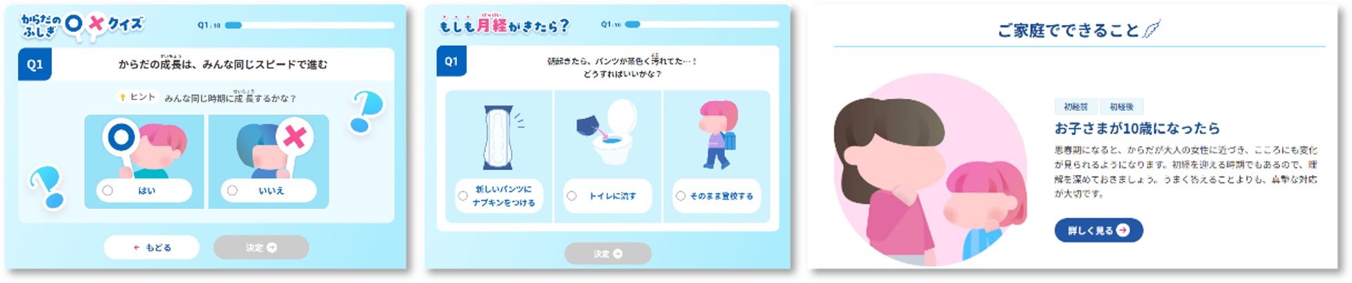 児童生徒が自ら前向きに学べるよう幅広いコンテンツを用意しています。また、保護者の方がお子さまの成長や月経について自然に向き合えるよう、必要な知識やコミュニケーションのヒントをわかりやすくまとめています。
