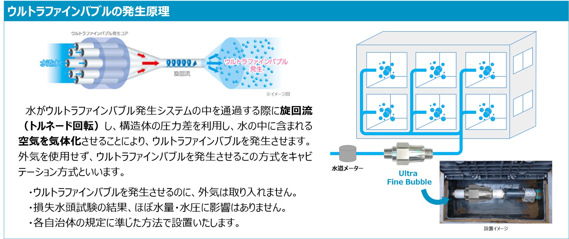 このような背景から、インターネット接続サービスを中心に様々な視点から「くらしをゆたかに」するサービスの提供に取り組んできた当社として、「ウルトラファインバブル」発生システムを新サービスとしてラインナップに加えることで、当社の顧客である管理会社様やオーナー様の物件価値のさらなる向上をサポートするとともに、入居者様の利便性・満足度の向上に貢献してまいります。