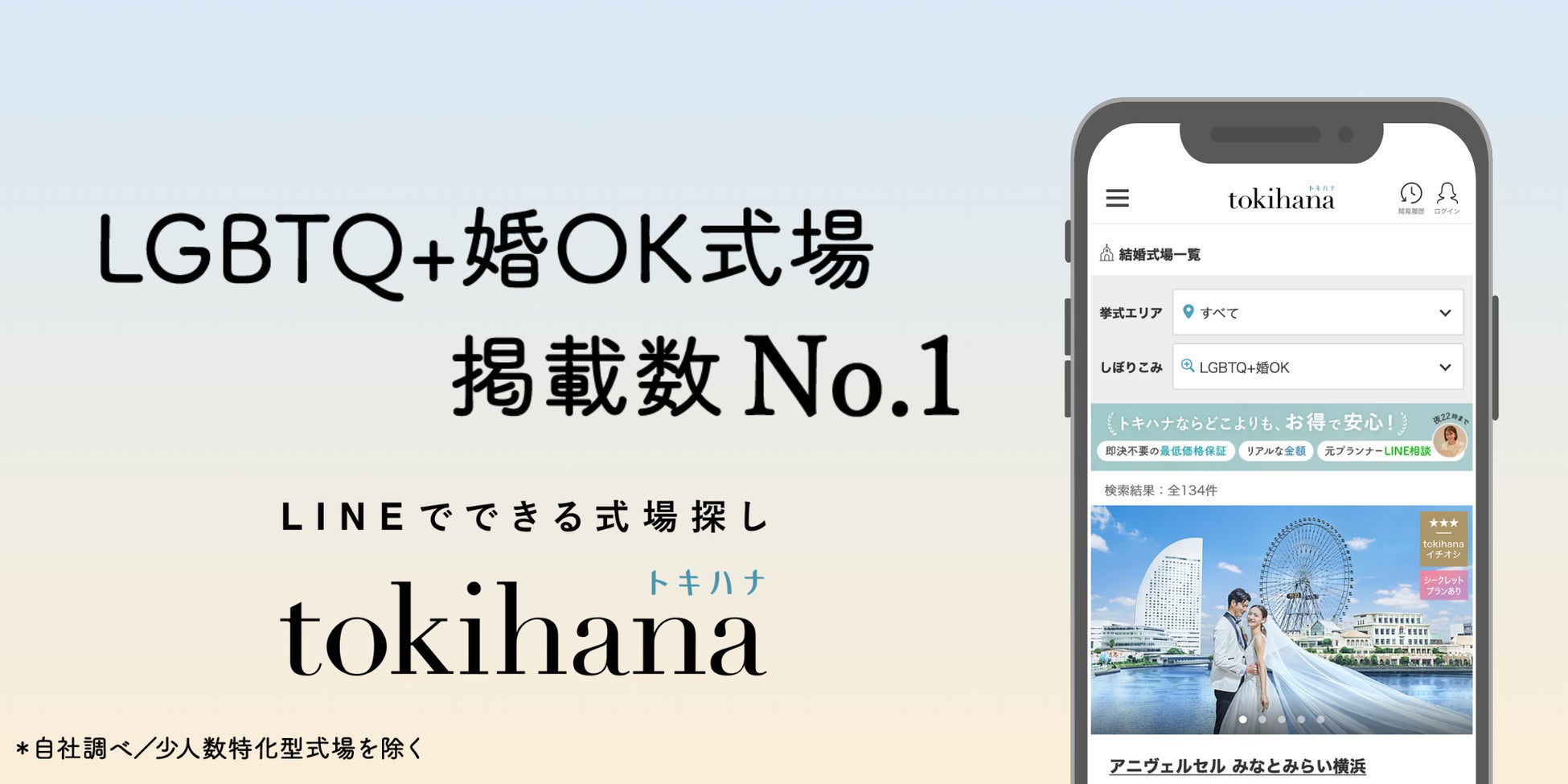 LINEでできる式場探し『トキハナ(https://tokihana.net/)』を運営する株式会社トキハナ(本社:東京都港区、代表取締役社長:安藤 正樹、以下 「トキハナ」)は、全国134会場を「LGBTQ+婚OK式場」として公開し、業界No.1*の掲載数となりました。