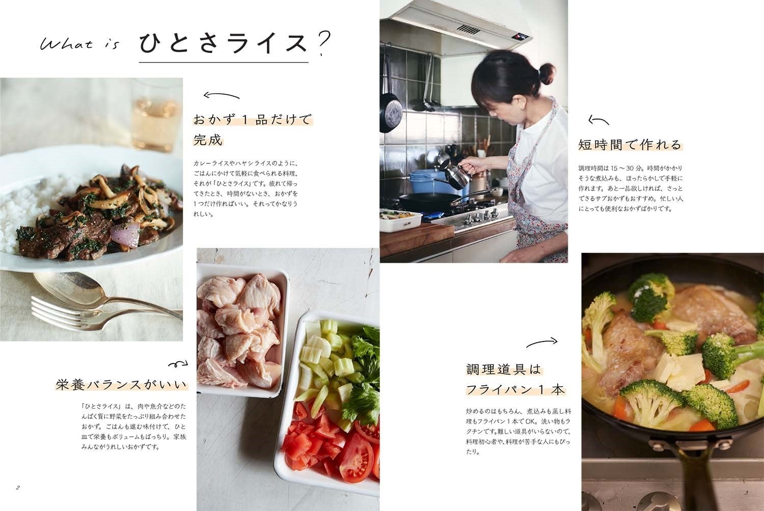 『ひとさライス』はひと皿+ライスを組み合わせた造語です。その名の通り、本書で紹介するレシピはすべてワンディッシュ。野菜とたんぱく質食材を組み合わせているので、一皿でバランスがとれるのも嬉しいポイントです。