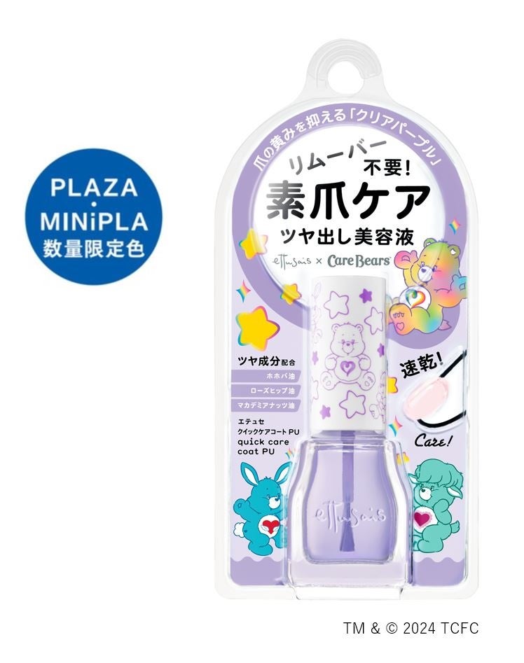 二枚爪や爪の割れ・欠けを透明薄膜ヴェールで爪を保護&ケアする”ネイル用美容液”クイックケアコート。おかげさまで200万個*を突破しました。今回、PLAZA・MINiPLA限定で登場するのは、爪の黄みを抑える「クリアパープルカラー」。さらに可愛いケアベア™デザインパッケージで数量限定発売します。