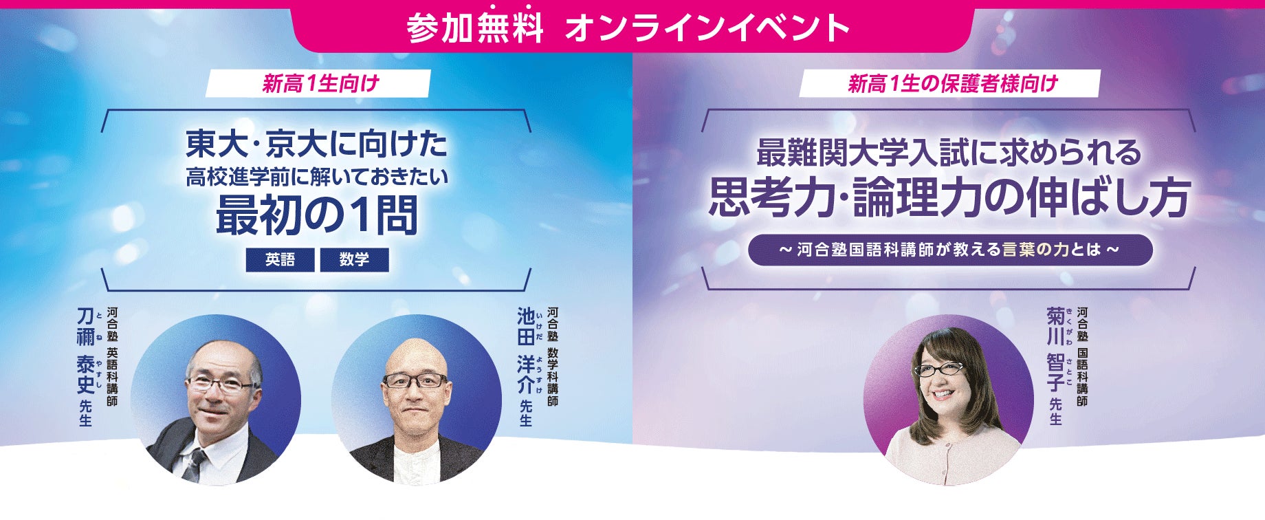 そこで、本イベントでは新高1生が難関大学をめざすための一歩目として、過去に出題された東大・京大の問題に挑戦し、難関大ではどのような力が要求されるのかを考え、学習指針を示します。さらに、どの科目にも通底する「思考力・論理力」の伸ばし方についてもお伝えするほか、保護者の方へ受験生を持つ親としての心構えや最新情報をお届けします。本イベントはオンラインで実施するため、ご家