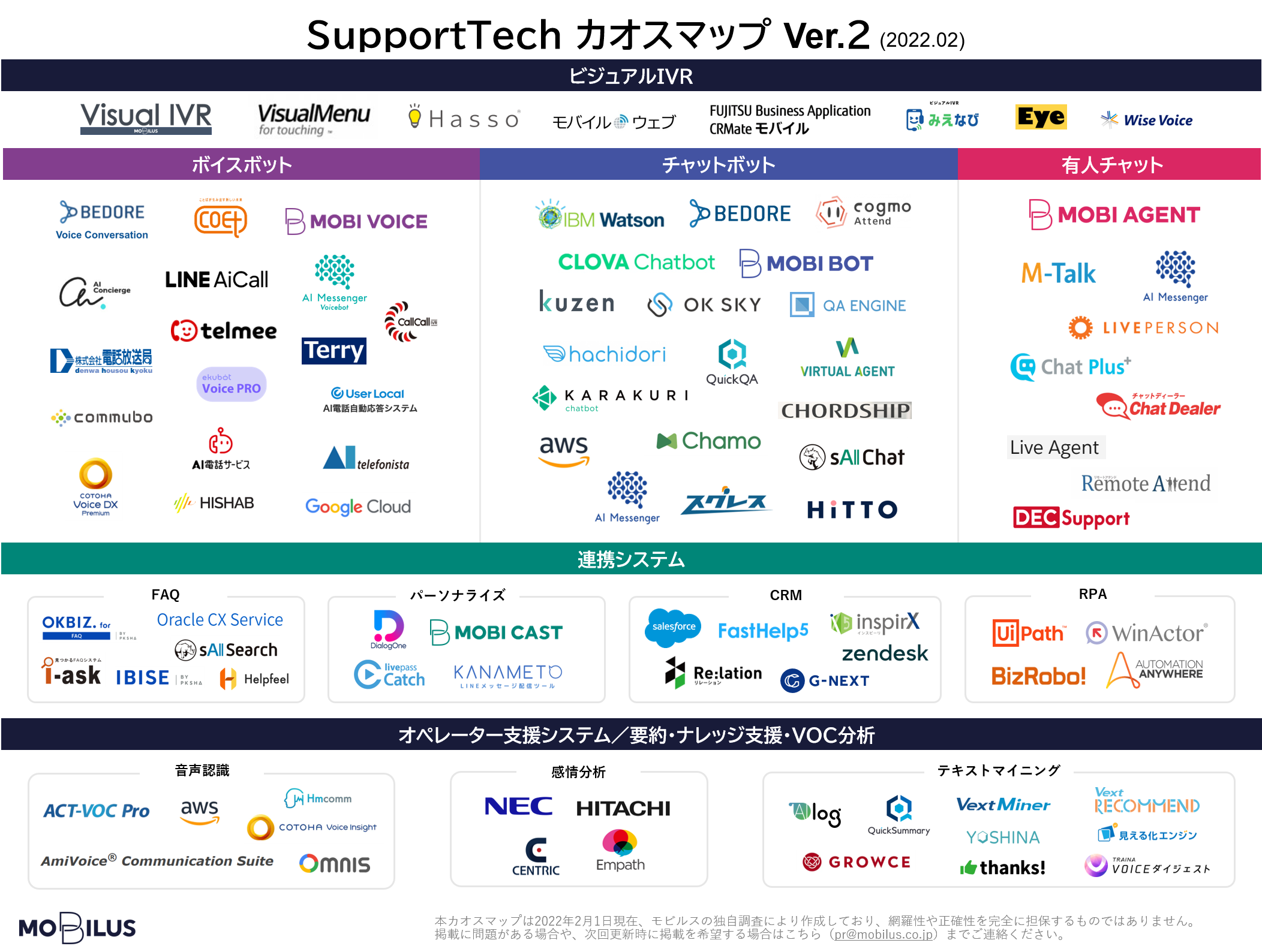 「SupportTechカオスマップVer.2(2022.02」は、「SupportTech」業界の現在地を見える化することを目的に、国内で展開する関連サービスを分類したものです。2020年12月の発表(https://mobilus.co.jp/press-release/24252)に続く、第2弾です。