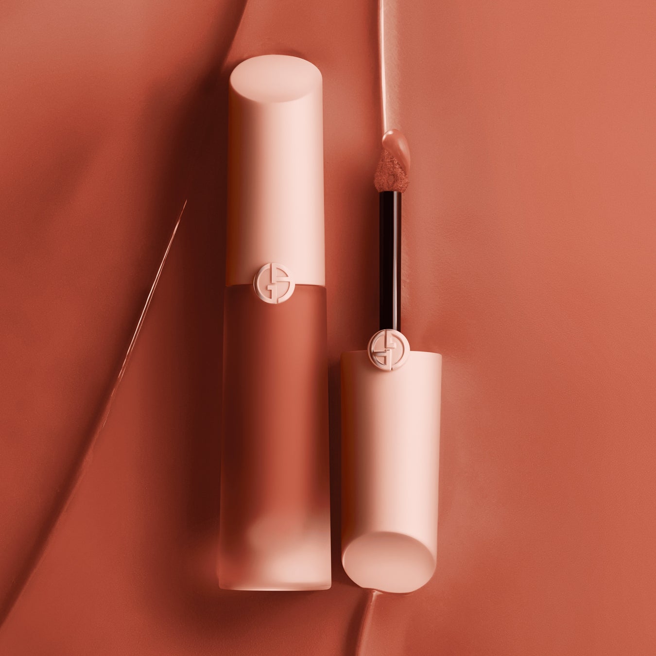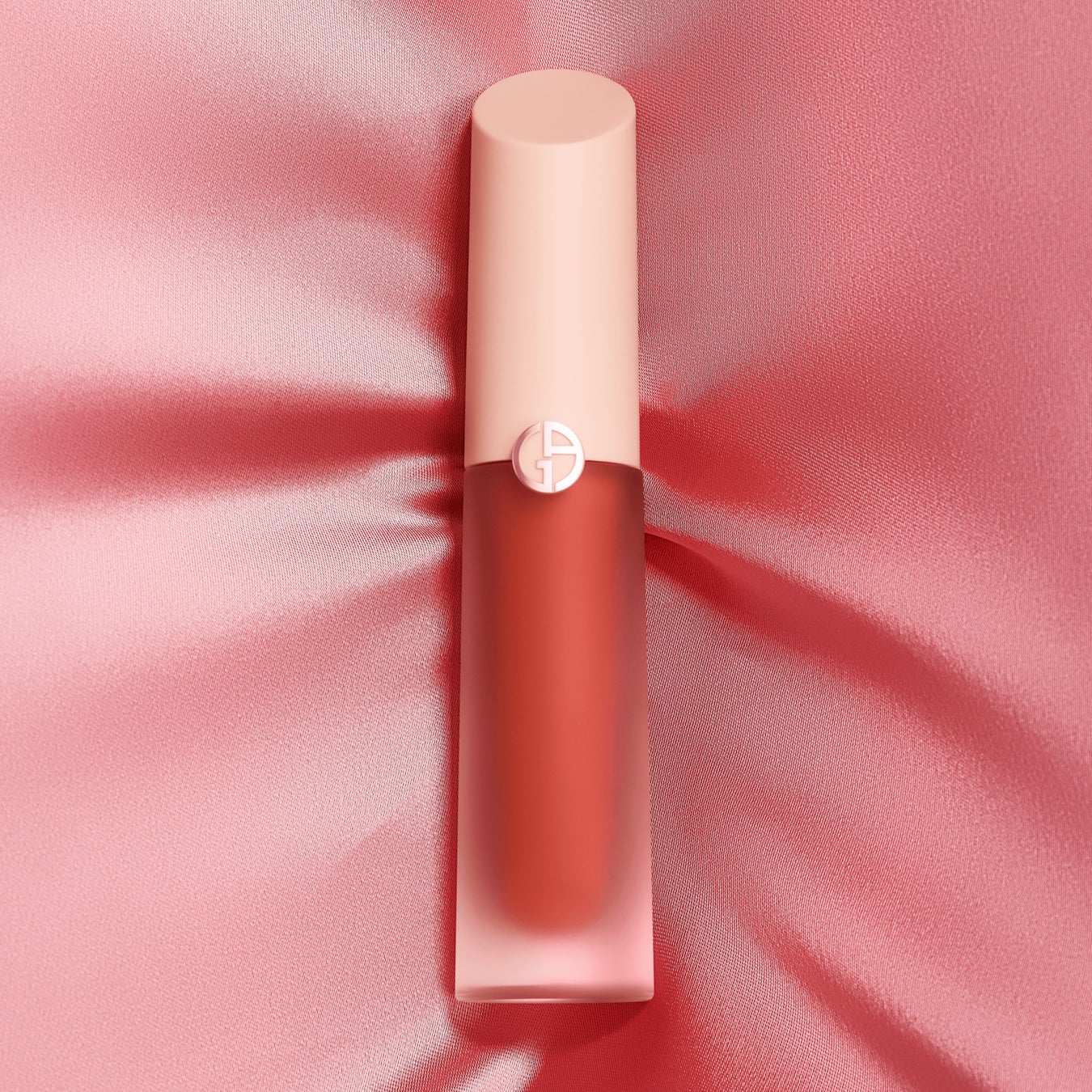 アルマーニ ビューティの特徴である楕円のボトルに、斜めにカットされたヌードピンクのキャップとすりガラスのようなデザインの組み合わせ。