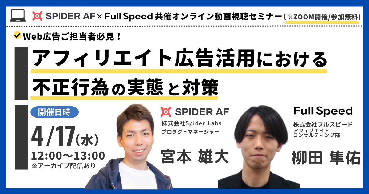 本連携に際して、4月17日(水)12:00よりウェビナーを開催予定です。Spider AFとフルスピードが持つアフィリエイトサービスについての説明と、両社が対談しアフィリエイト不正の実態をお話しいたします。