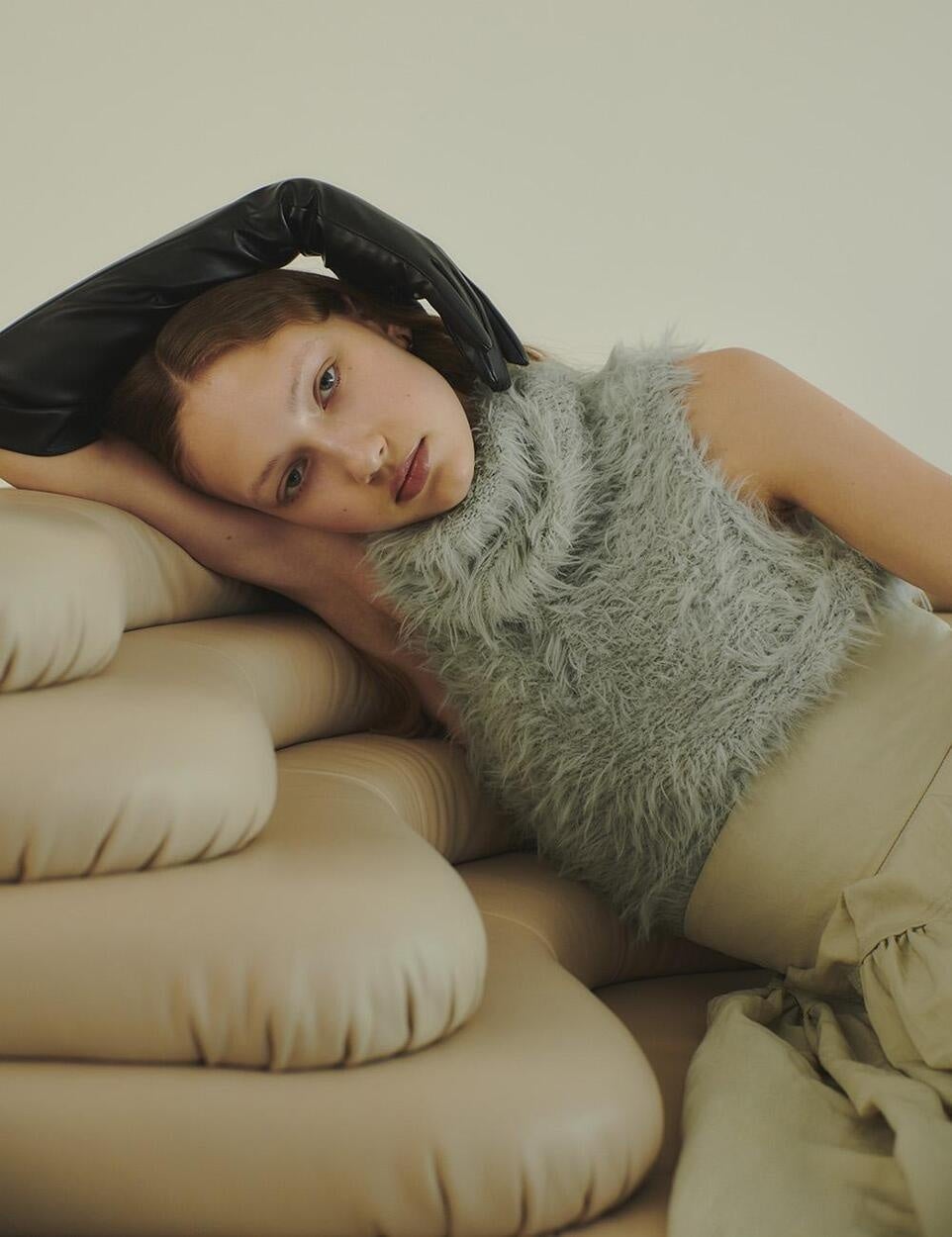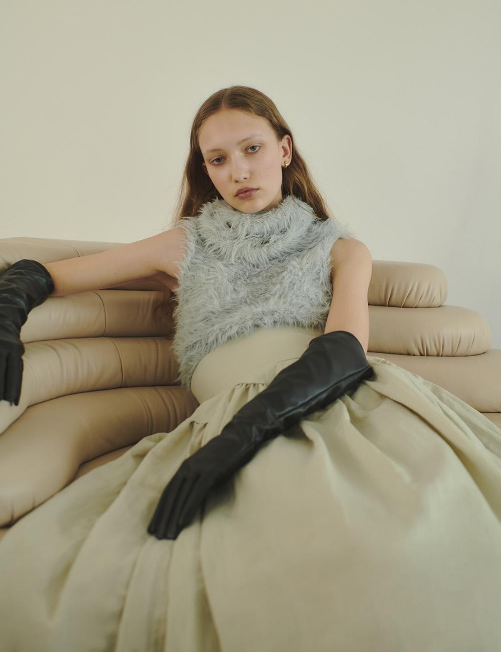 毛足が長い生地感が愛らしい1枚。シャギーの生地が触り心地、着心地も良く温かみもあります。