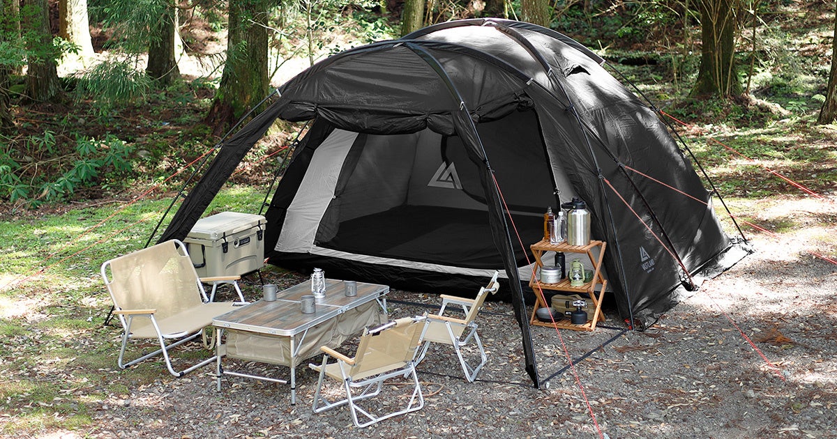 タープ不要で寝室の前に広々リビングスペース有。自立式テントで初心者が設営しやすい。