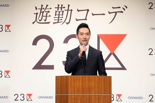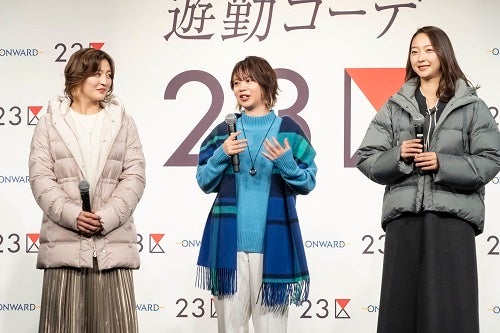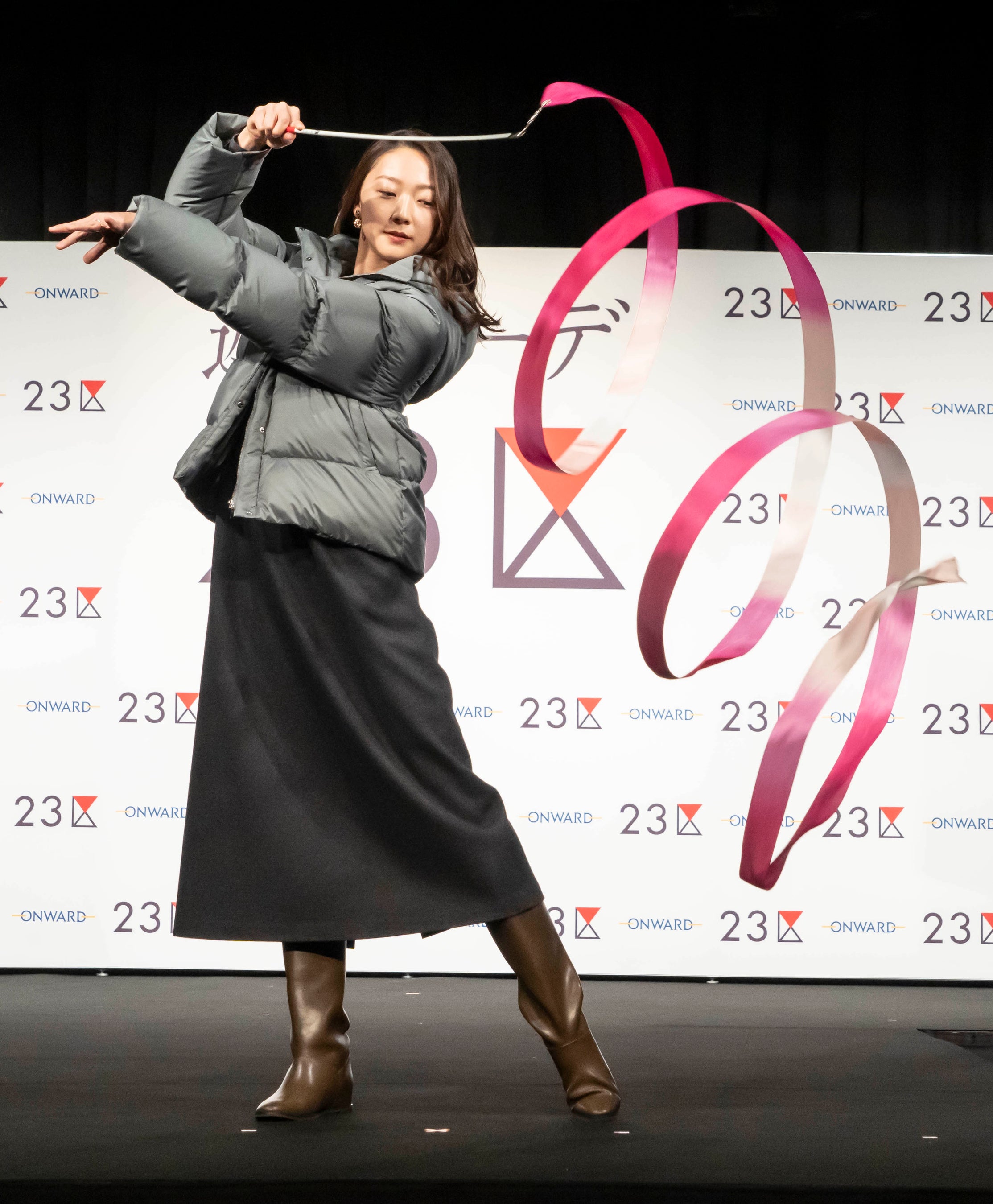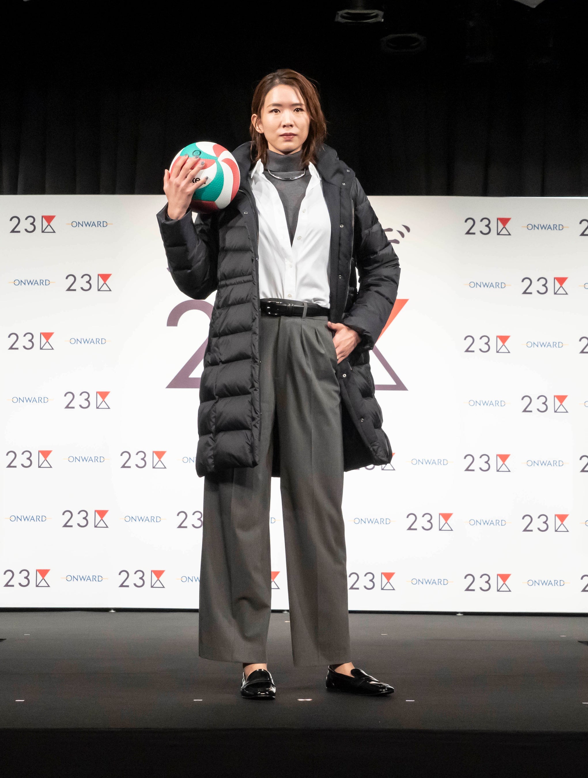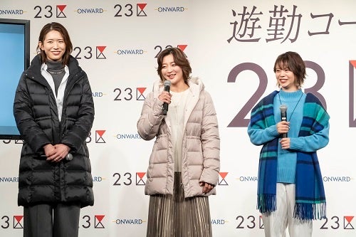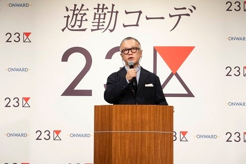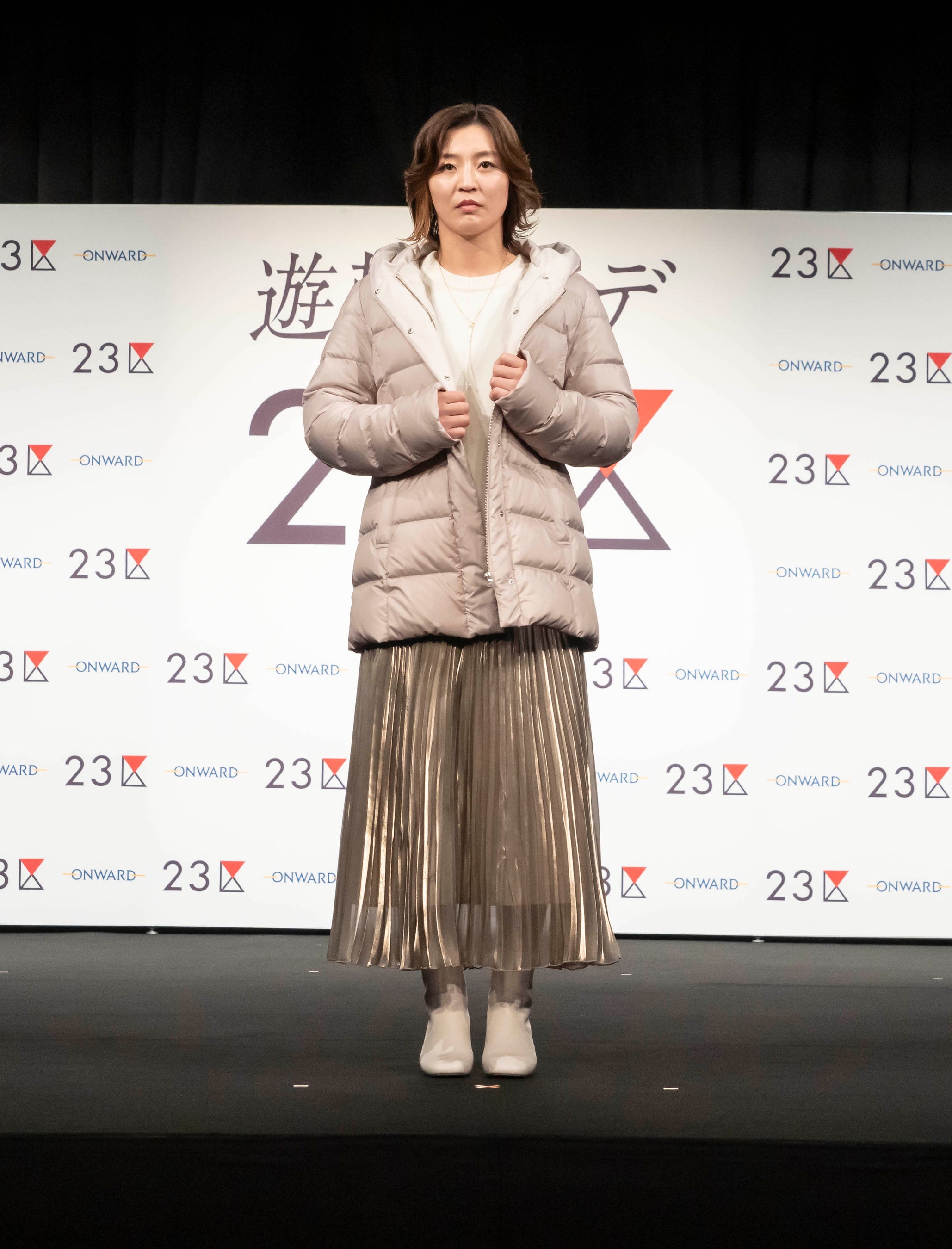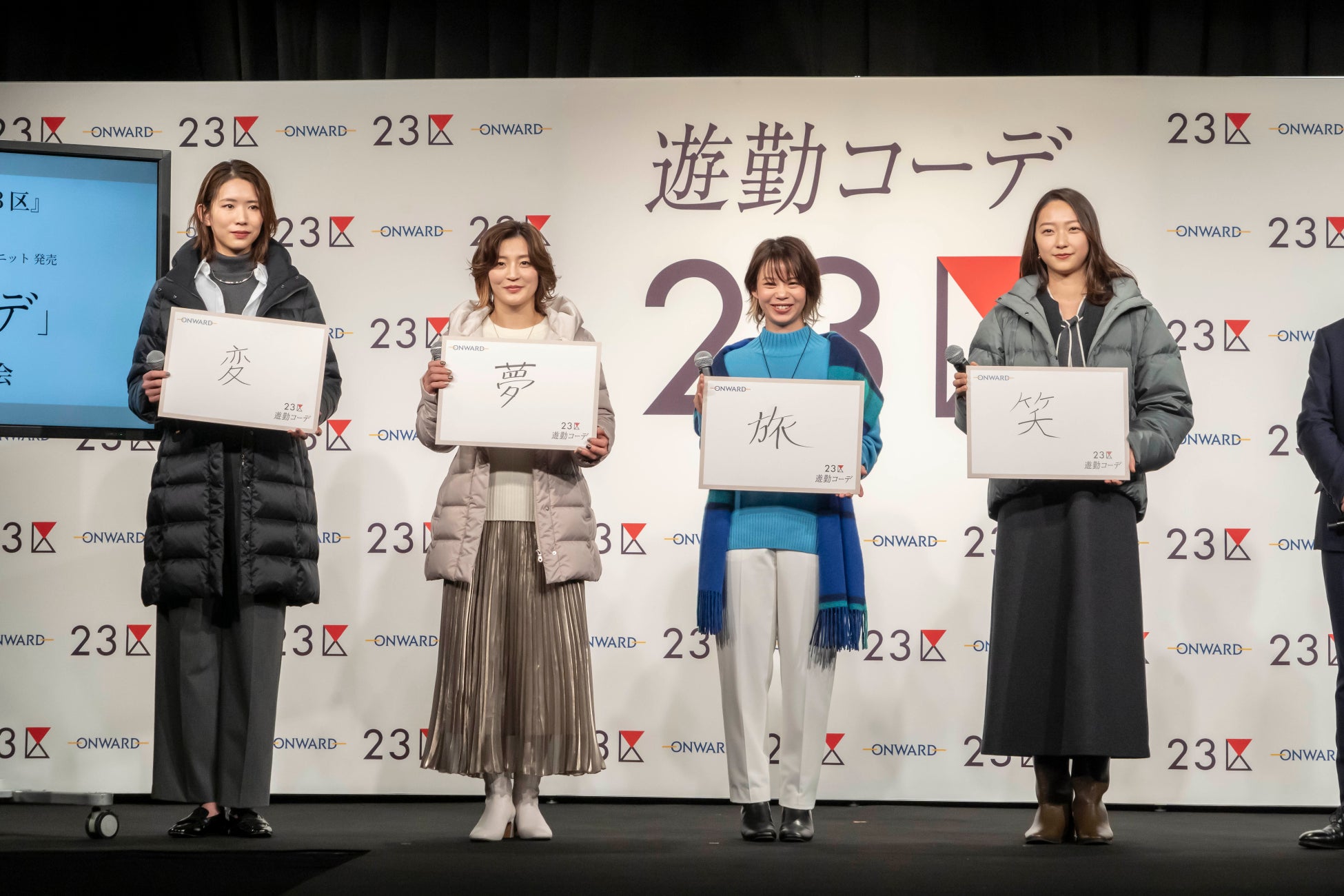 発表会の冒頭では、当社 取締役常務執行役員 第一カンパニー長 小林 一仁より、『23区』ブランドとこれまでの取り組み、「遊勤コーデ」の説明をおこないました。この度のアスリートの起用について『「遊勤コーデ」の提案は、着膨れしがちな冬でも美しいシルエットと、心まで軽やかになるカラーリングで、いつもの通勤服に遊び心をもたらすということをコンセプトとしています。この提案を、世の中にインパクトを持って伝えていくために、ブランドとして初めてアスリートを起用いたしました。本当にチャレンジングでしたが、競技を通して日本中に勇気を与えていただいた沢山のアスリートの方々の中から、今回ご縁が叶い、夢のような組み合わせの4名に、モデルとしてデビューをしていただくことになり、大変嬉しく思います』と話しました。