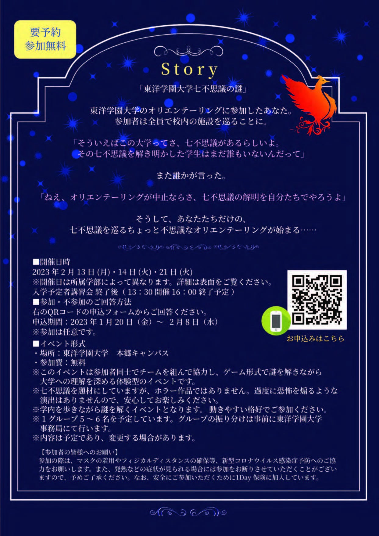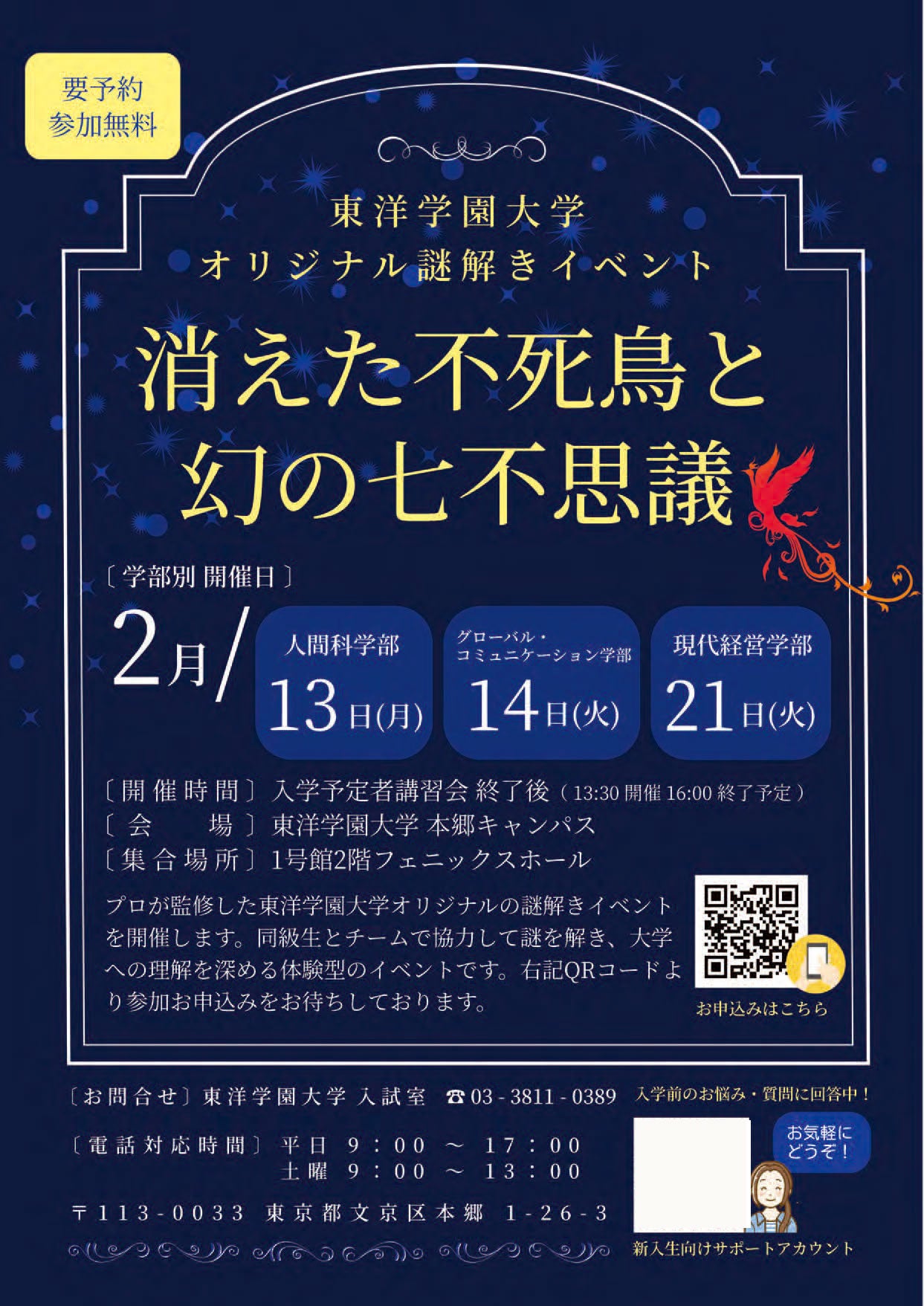 東洋学園大学(学校法人東洋学園 本部:文京区本郷 理事長:愛知太郎)は、独自の入学前サポートプログラム『トーガクミーグリ(TOGAKU Meet&Greetの略称)』として、合格後から入学までの間に入学予定者が先輩学生や教職員と交流できるイベントを開催しています。昨年度は感染症再拡大のため中止となりましたが、本年度は2023年度の入学予定者を対象に、対面形式の本学オリジナルの謎解きイベント「消えた不死鳥と幻の七不思議」を学部別に開催しています。次回は2月21日(火)に現代経営学部入学予定者を対象に実施します。