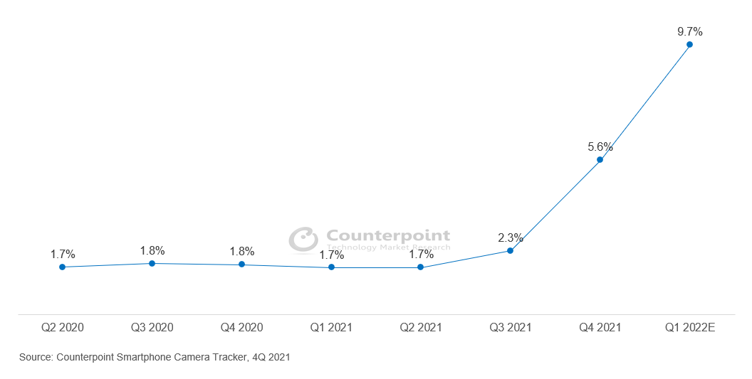カウンターポイント・テクノロジー・マーケット・リサーチ (英文名: Counterpoint Technology Market Research 以下、カウンターポイント社)は、スマートフォン背面のメインカメラに50MPを採用したスマートフォンの販売シェアは、2021年第2四半期には1.7%だったものが、第4四半期には5.6%へと跳ね上がったというSmartphone Camera Tracker Serviceによる最新調査を発表致しました。