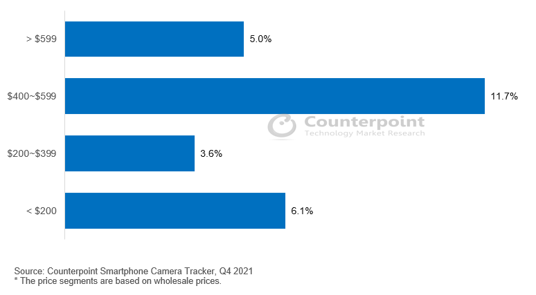 最近では、50MP(画素ピッチ1.0μm以上)センサーが、価格低下を受けて、中~高級機市場に入り始めています。まず、2020年2月にSonyが同社の50MP製品IMX700のカスタム版を、Huaweiに供給し始め、SamsungとOmniVisionも50MPセンサーを発売した結果、50MPセンサーの価格は、2020年第2四半期と比べて二桁もの下落を記録しました。これを受けて、realme GT Master Explorer Editionなど、多くの中級機が50MPを採用し始め、これが50MPの400~599米ドル(約5万~7.5万円)セグメントにおけるシェアを2021年第2四半期の4.2%から、2021年第4四半期の11.7%へと押し上げる結果となりました。