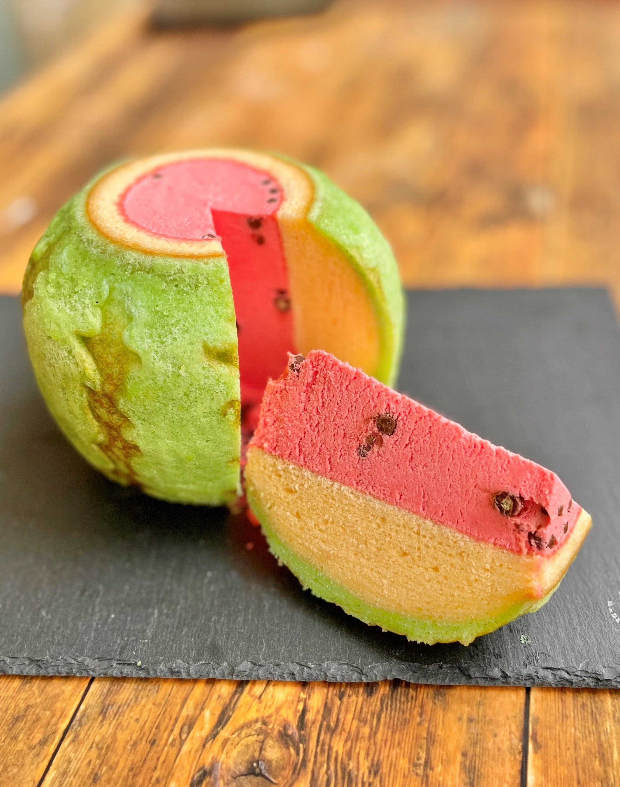 プレーン味とメロン味の二層で焼き上げ、中にはスイカのムースを流し込み、チョコチップでスイカの種を再現しました!