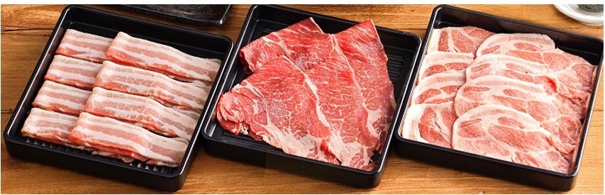 牛肩ロース、豚ロース、豚バラ肉と3種を取り揃えております。お好みに応じて追加オーダーやコースをお選びいただけます。
