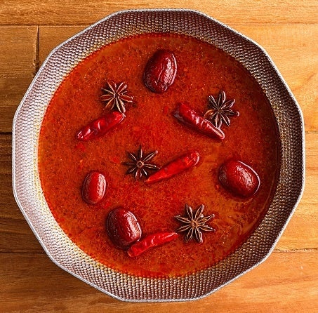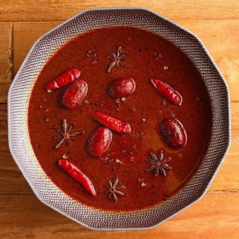 スパイスをオリジナルで配合し、香りや痺れを楽しむ王道の火鍋スープ。麻辣味の赤の「紅湯(ホンタン)」は唐辛子や花山椒、ナツメ、八角など調味料とスパイスを炒めて旨味を引き出した、痺れる辛さが病みつきになる定番スープです。