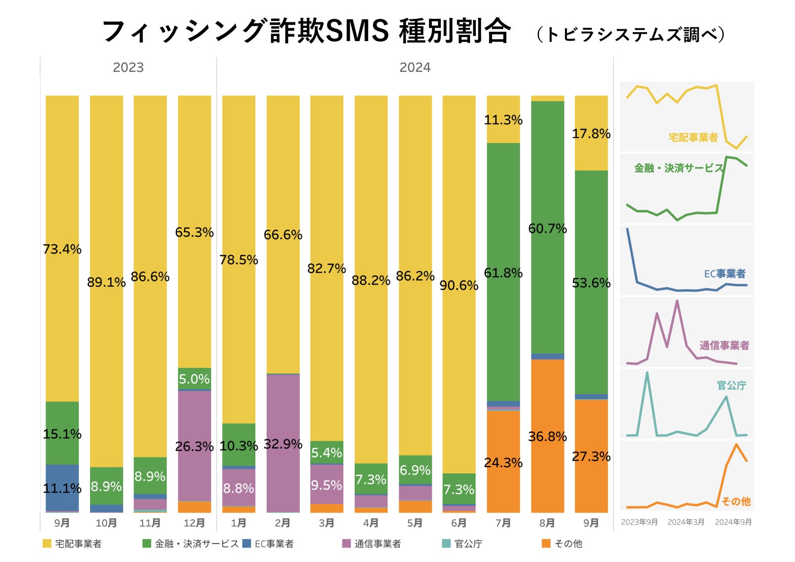 トビラシステムズの調査で、2024年9月に確認されたフィッシング詐欺のSMSの種別割合は、金融・決済サービスをかたる手口が最も多く53.6%となりました。前月に減少した宅配事業者をかたる手口が再び増加し17.8%となりました。その他の事業者をかたる手口の割合は27.3%で、主に電力会社をかたるSMSが多発しています。