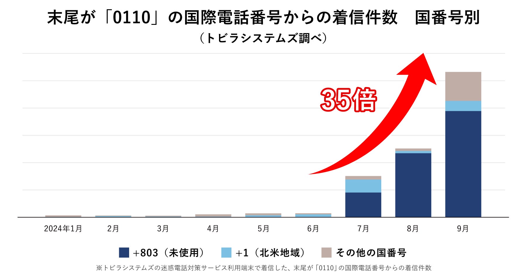 トビラシステムズの調査で、末尾が「0110」の国際電話番号からの着信件数は今年7月から増加傾向が続き、9月は増加前の6月と比べて35倍まで急増しています。国番号別では、使用されていない国番号「+803」からの着信が増加しています。また、これらの番号の中には、国番号を除いた部分が実在する日本の警察署の電話番号と一致するものも確認されています。