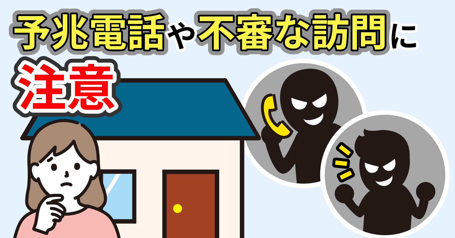 犯行グループは、犯行前にターゲットの情報を収集している可能性があります。犯罪の予兆電話や不審な訪問に日頃から注意してください。