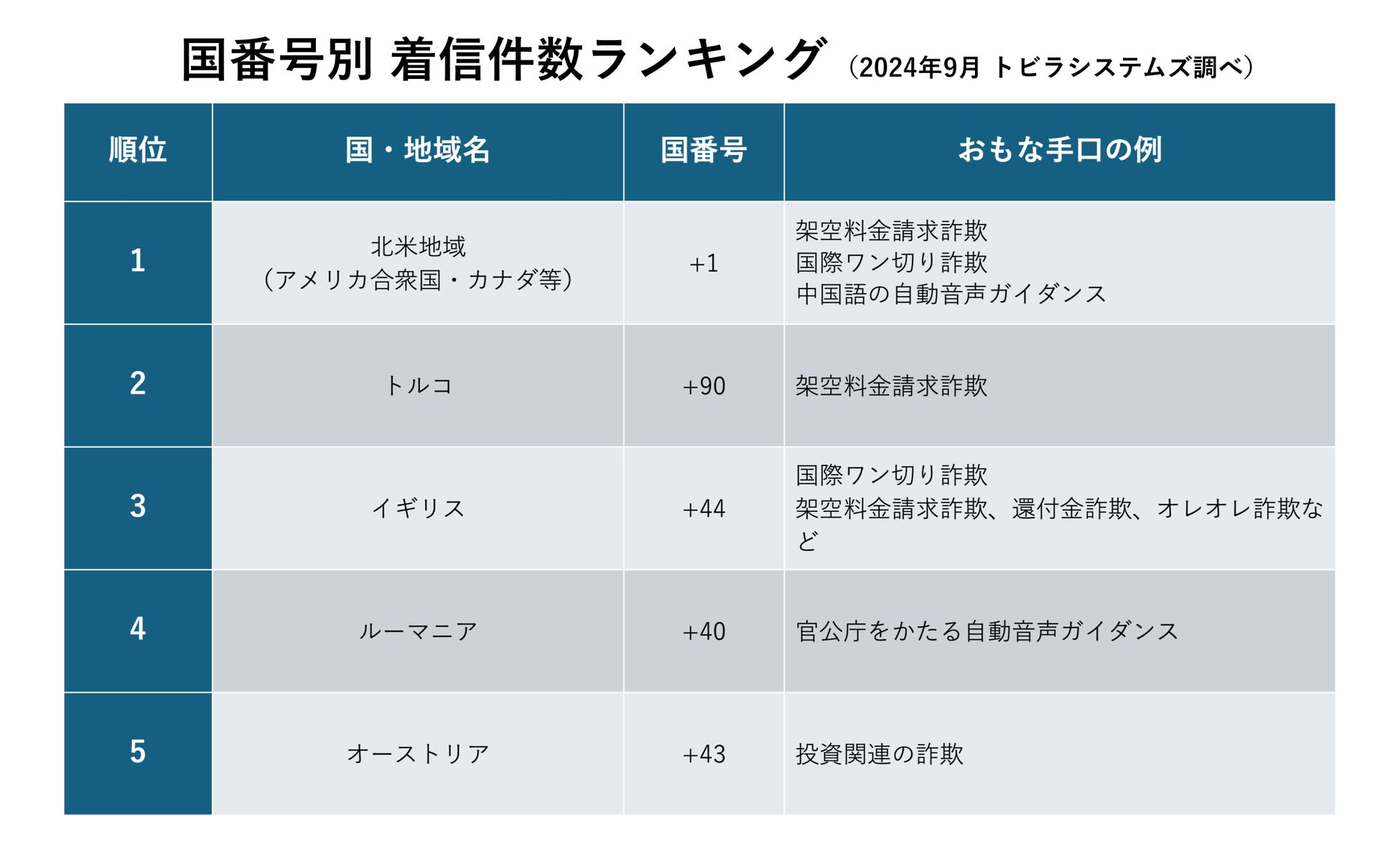 当社の調査で、2024年9月に着信件数が多かった国際電話の国番号は、上位からアメリカ合衆国やカナダなどの北米地域、トルコ、イギリス、ルーマニア、オーストリアでした。