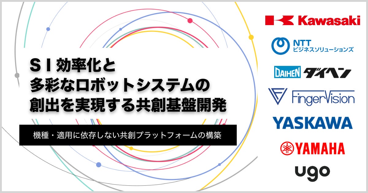 川崎重工業株式会社、NTTビジネスソリューションズ株式会社、株式会社ダイヘン、株式会社FingerVision、株式会社安川電機、ヤマハ発動機株式会社、ugo株式会社は、NEDO (国立研究開発法人新エネルギー・産業技術総合開発機構)が公募した委託事業である「ポスト5G情報通信システム基盤強化研究開発事業/ロボティクス分野におけるソフトウェア開発基盤構築」に対し、「SI効率化と多彩なロボットシステムの創出を実現する共創基盤開発」を提案し、採択されました。本プロジェクトの研究開発期間は、2025~2027年度を予定しています。