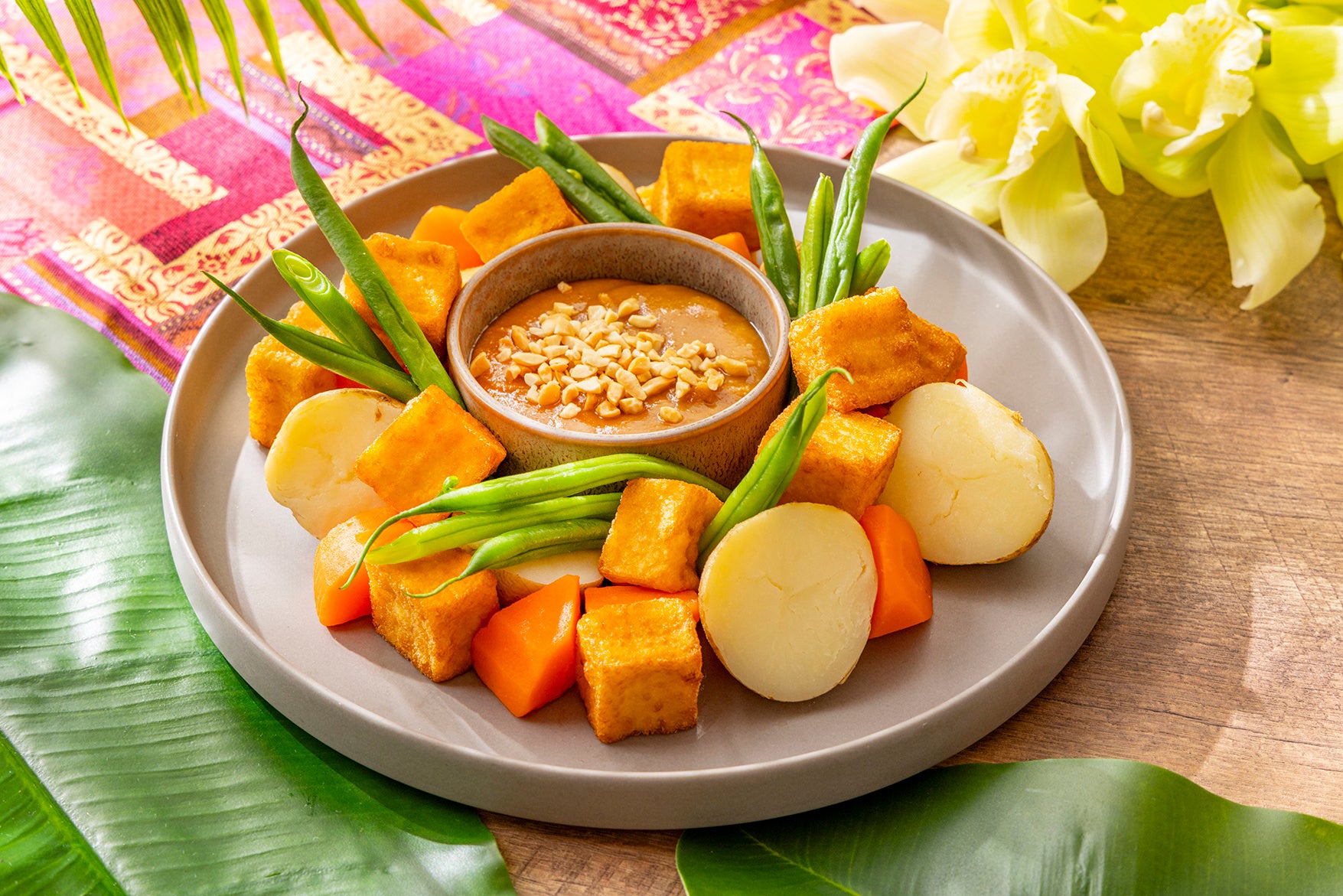 温かい野菜にピーナッツソースをかけて味わう、インドネシアの代表的な料理「ガドガド」。厚揚げを加えて、ヘルシーながらも満足感のある一品。