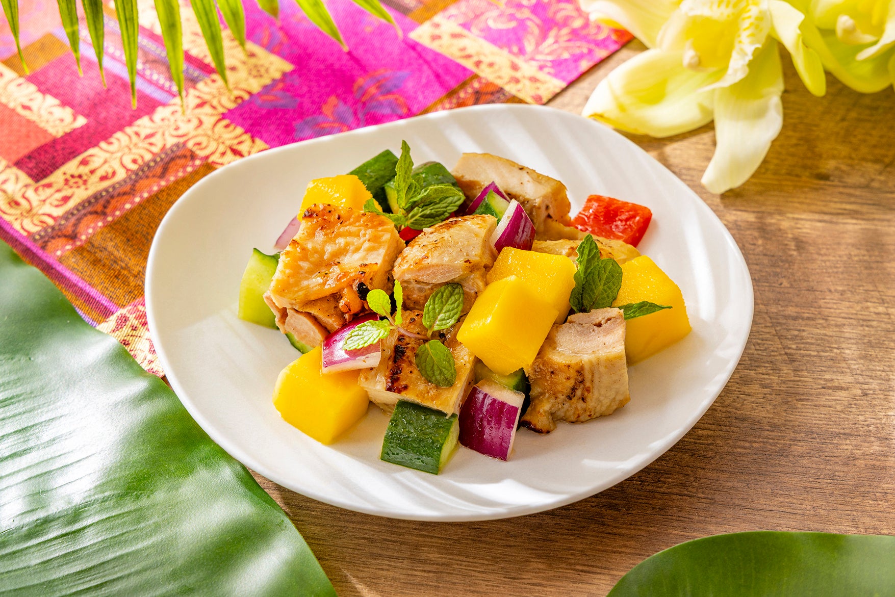 スパイシーに焼き上げたジャークチキンに、甘酸っぱいマンゴーサルサを添えた、スパイスとフルーツでパンチのある味わい。