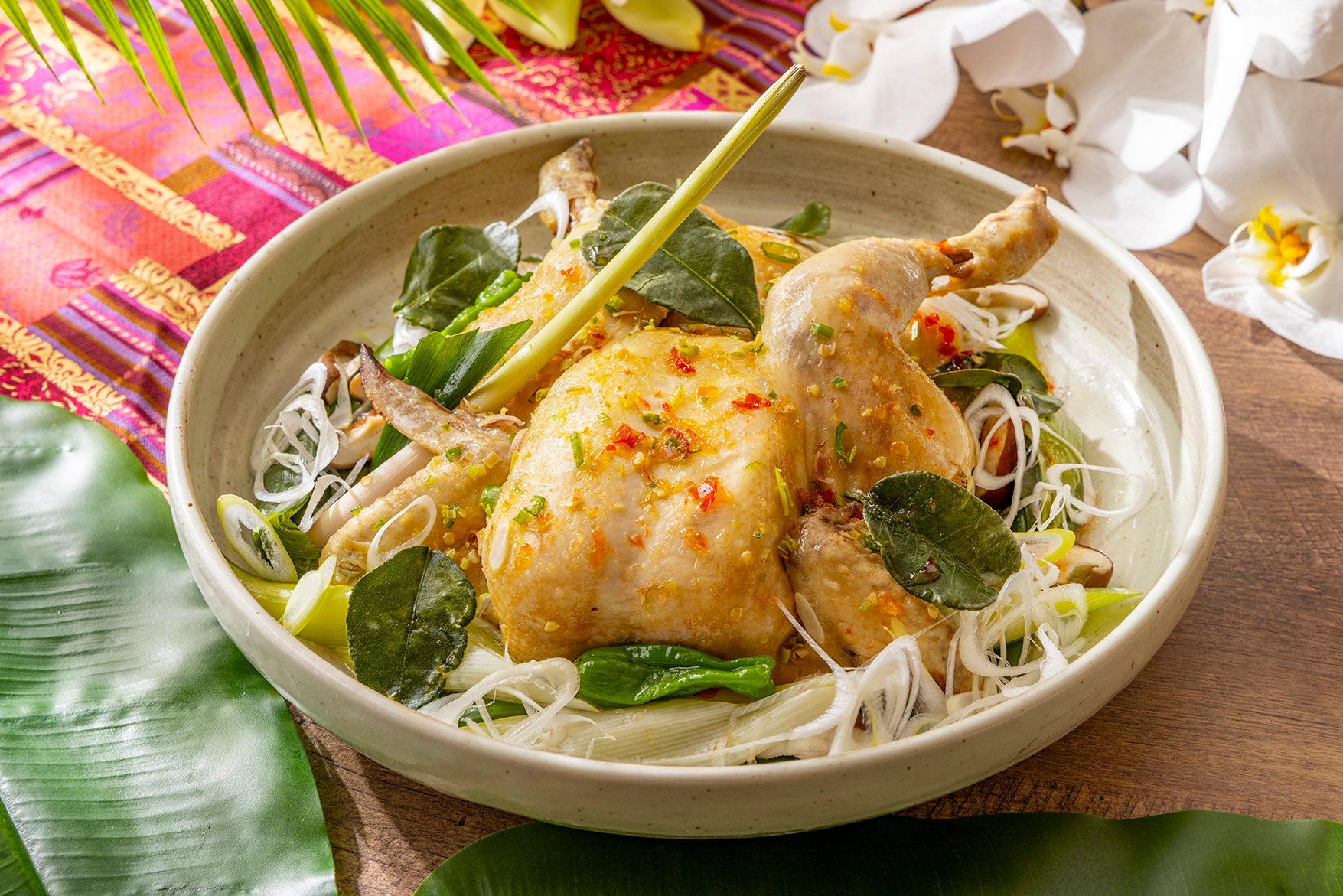 生姜やレモングラスでマリネし、しっとりと蒸し上げたチキンを、タイ風スイートチリソースで。