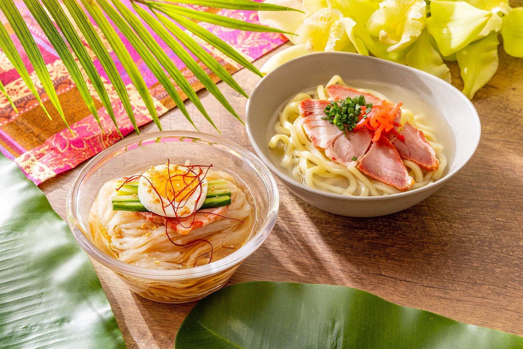 豚と鰹の旨みを味わう沖縄の郷土料理「沖縄そば」、冷たいスープにつるりとした麺の喉ごしが夏に嬉しい「韓国風冷麺」など日替わりで提供。