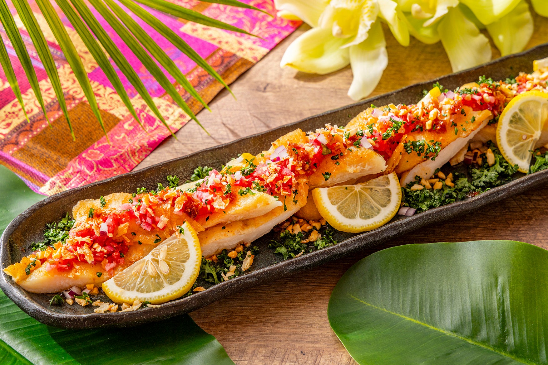 ナンプラーやにんにく、生姜でマリネし香ばしく焼き上げた白身魚に、エビの旨みが凝縮されたベトナム調味料サテトムを使用したピリ辛ライムソースを合わせて。
