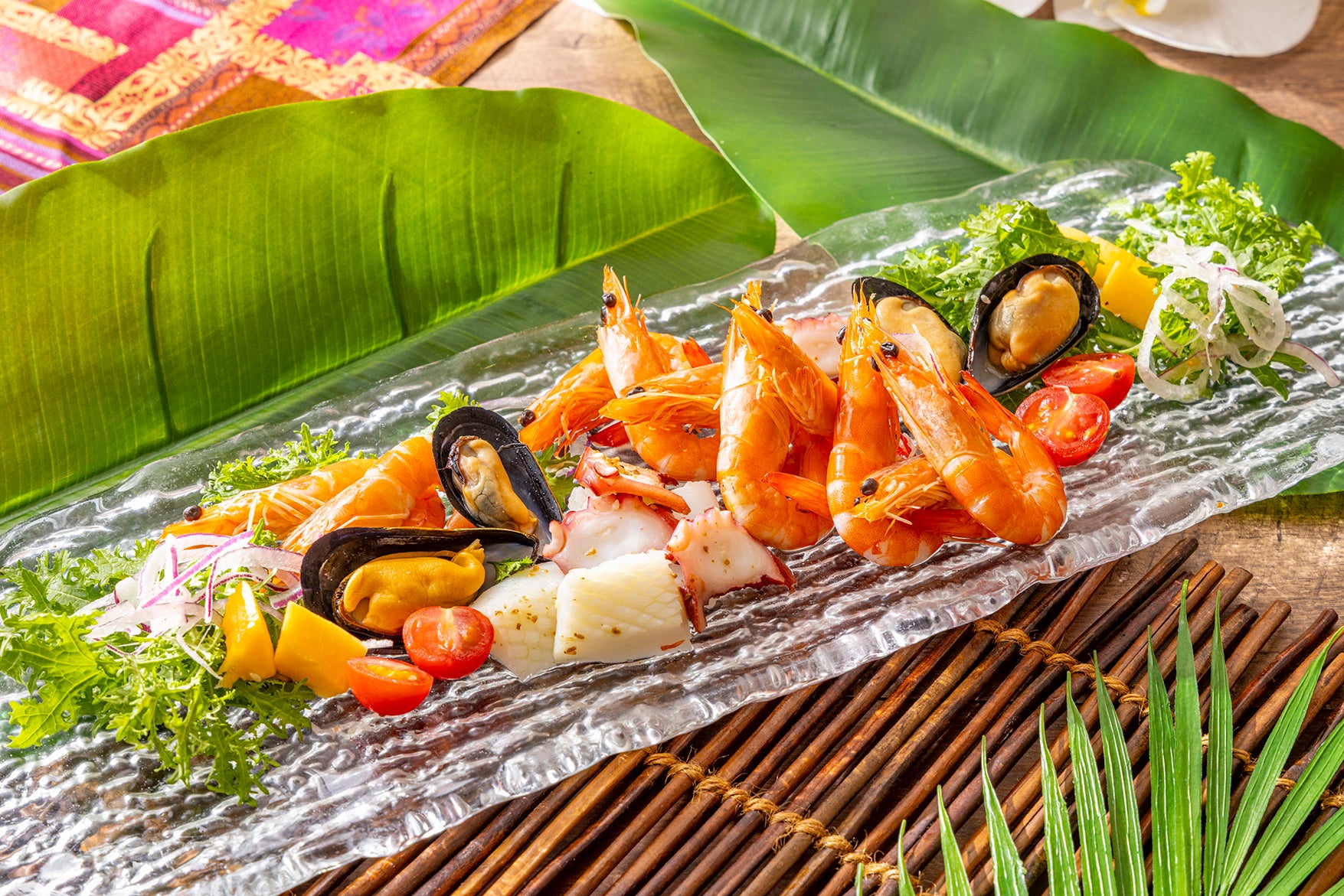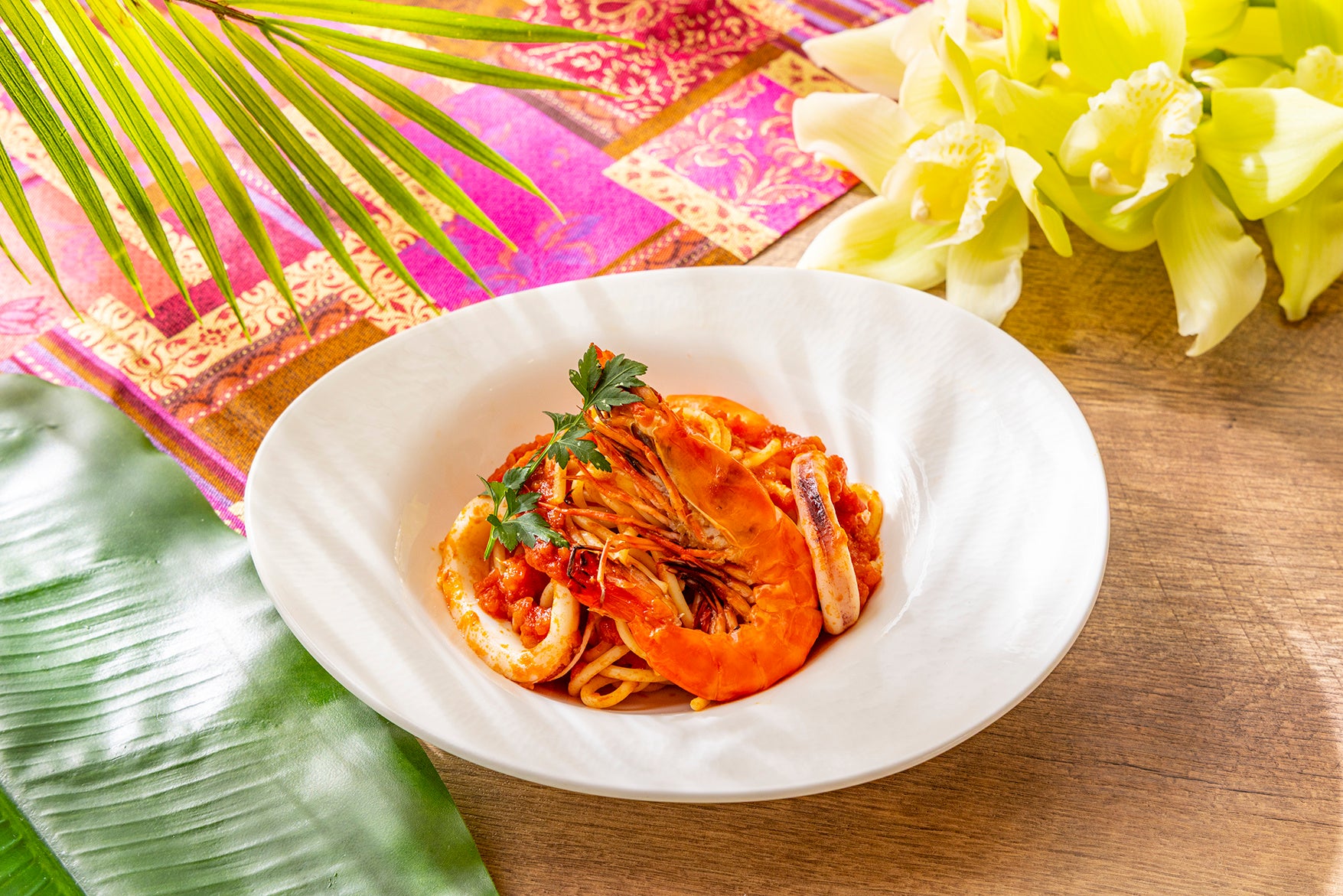 シーフードに、ナンプラーやライム、レモングラスなど南国の香りをまとわせた、爽やかでリゾート感あふれる一皿。