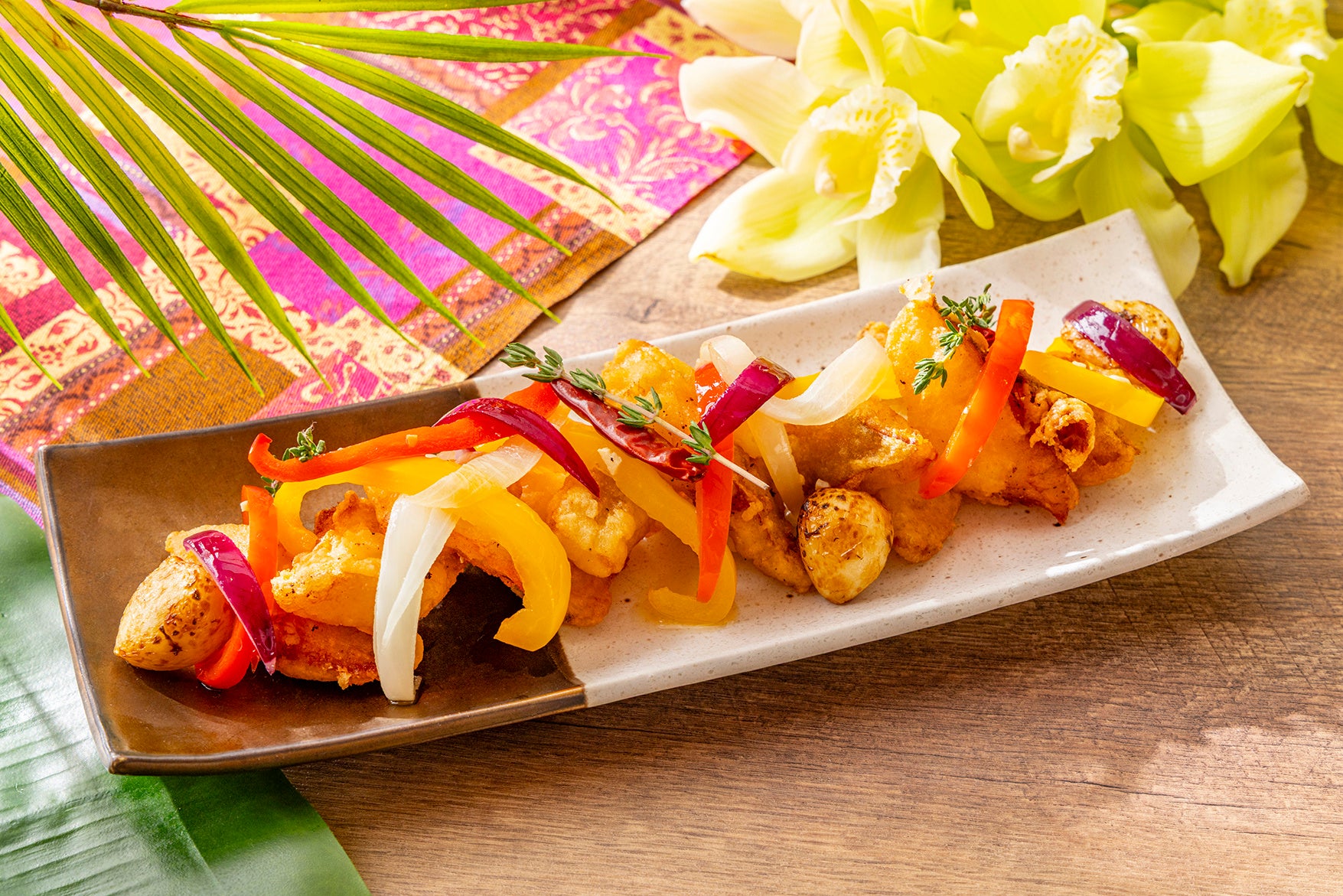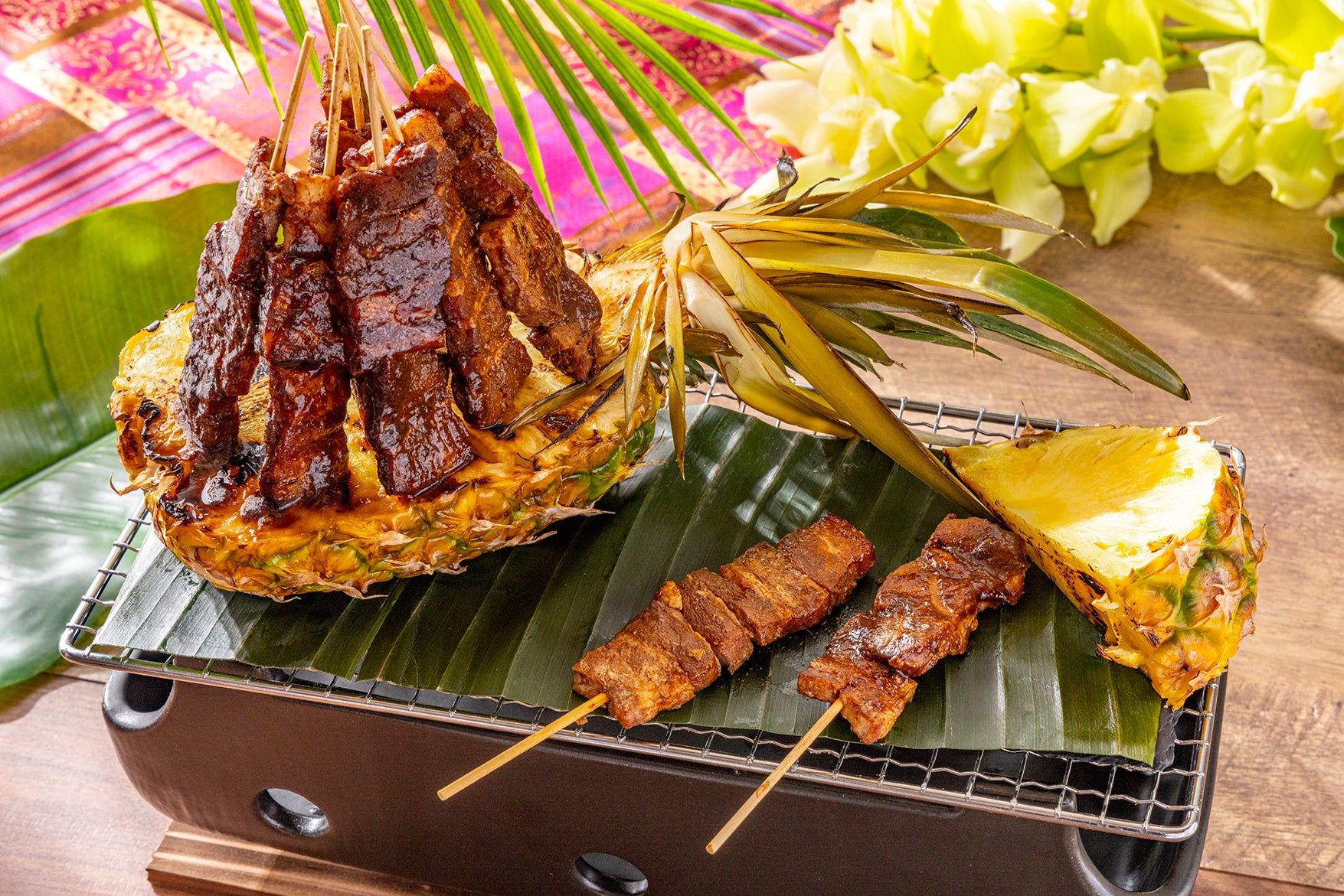 インドネシアの伝統料理サテを豚肉でアレンジ。甘辛い特製だれと香ばしく焼き上げたパイナップルが相性抜群の一品。