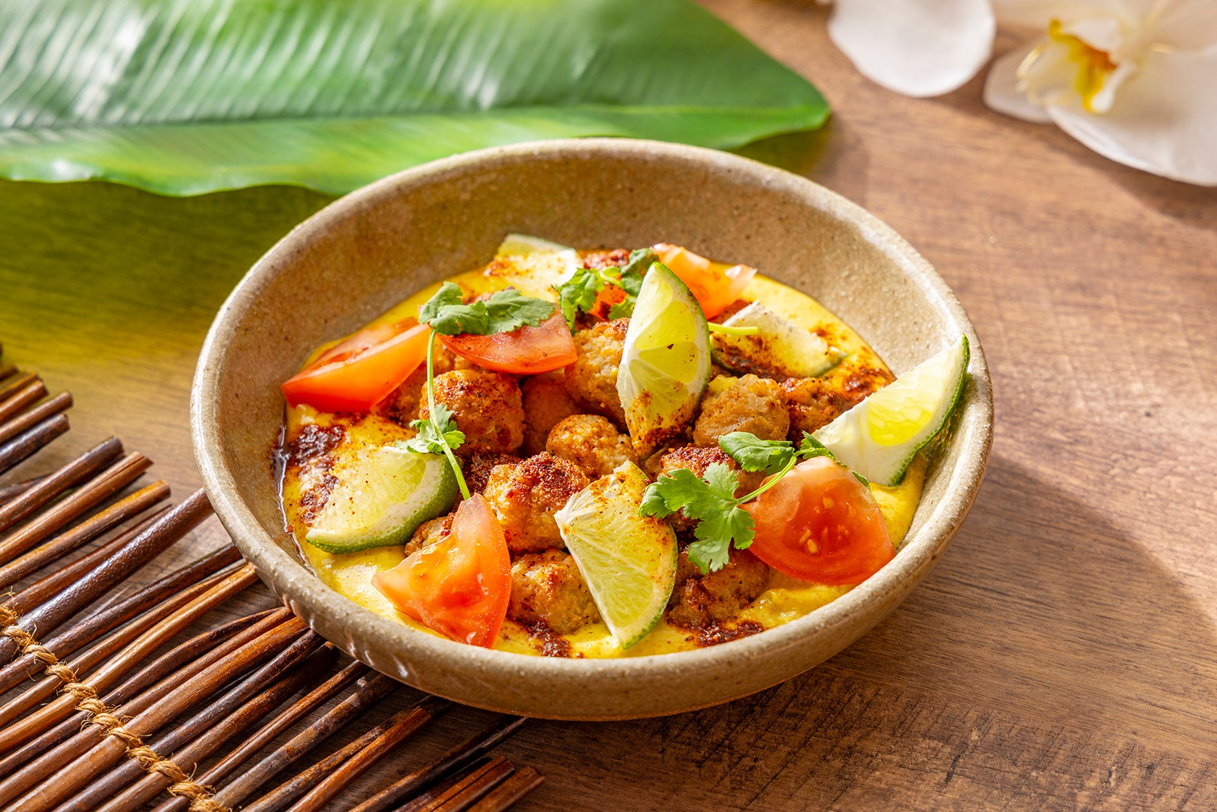 ジャマイカのスパイス「ジャークシーズニング」で風味豊かに仕上げたミートボールを、コクのあるココナッツカレーソースと合わせて。