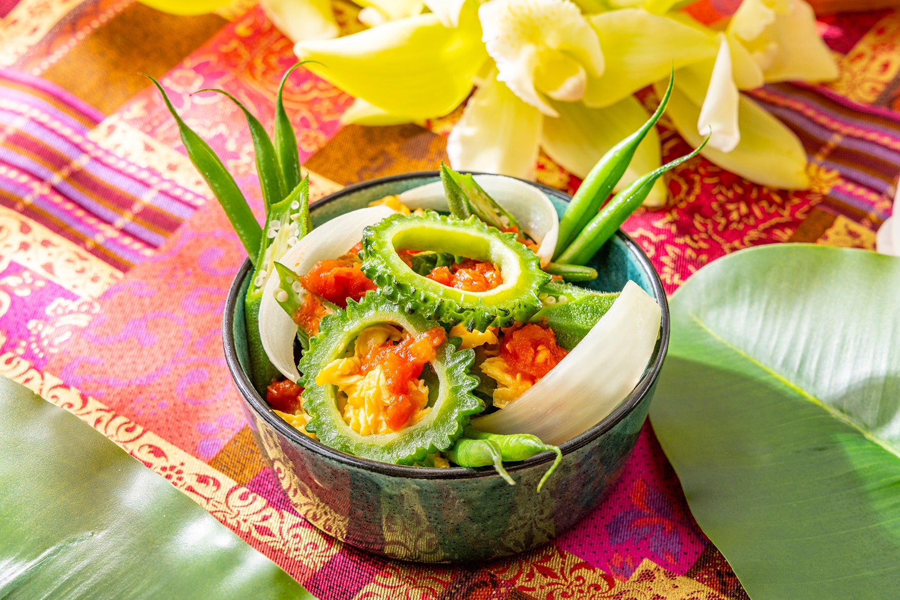 フィリピンで親しまれているゴーヤ料理。卵に加え、トマトや魚醤を使用し、ほんのり酸味と旨みのあるアジアンテイストに仕上げました。
