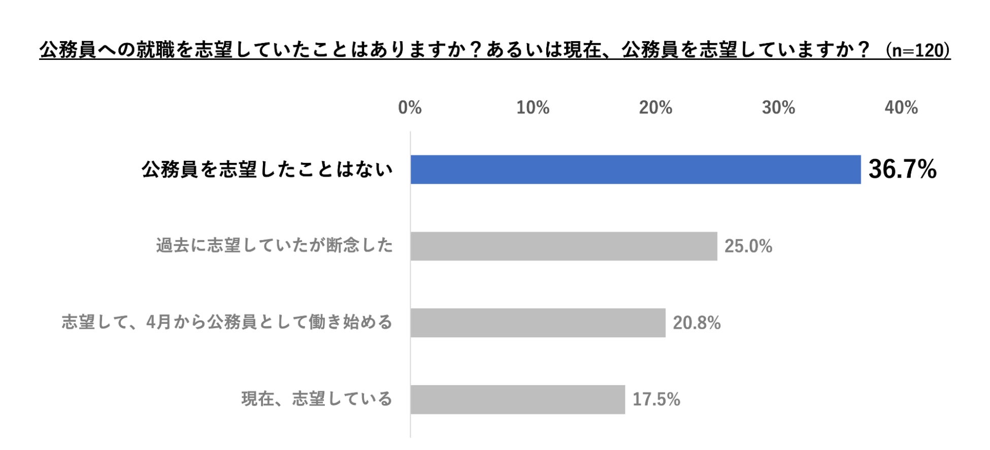 「公務員への就職を志望していたことはありますか?あるいは現在、公務員を志望していますか?」という質問に対して、全体の36.7%が「志望したことはない」と回答しました。LINEリサーチが実施した調査(※)では「国家公務員・地方公務員」が「高校生のなりたい職業」の1位となった一方、大学生の約4割は志望したことがないという結果となりました。
