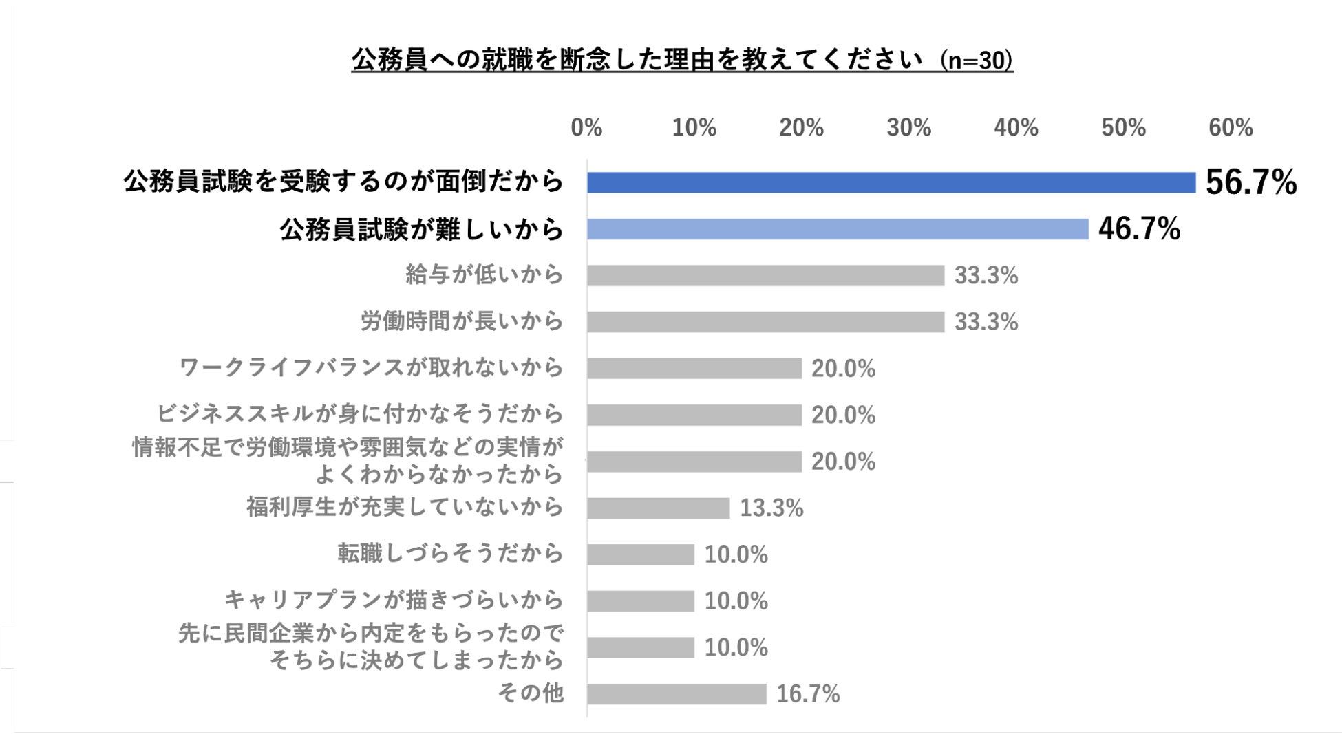 1の質問に対し、「過去に公務員を志望していたが断念した」学生は25.0%でした。断念した学生に理由を聞いたところ、「公務員試験を受験するのが面倒だから」という回答が最も多く56.7%、続いて「公務員試験が難しいから」が46.7%でした。「給与が低いから」や「労働時間が長いから」といった給与や働き方よりも、公務員試験というハードルが公務員への思いを阻む要因になっていることがわかる結果となりました。