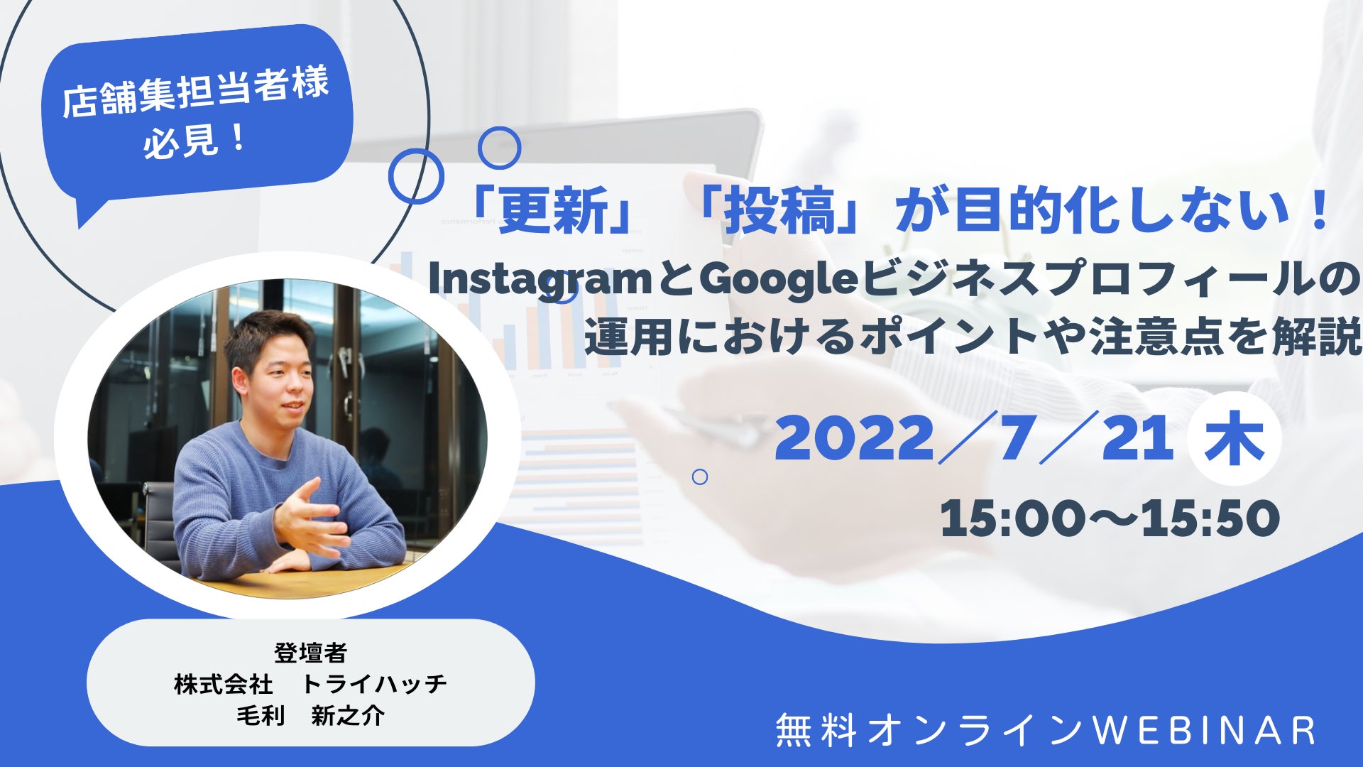 株式会社トライハッチ(所在地:東京都新宿区、代表取締役:武藤 尭行、以下「トライハッチ」)は、「店舗集客担当者様必見!【更新】【投稿】が目的化しない!InstagramとGoogleビジネスプロフィールの運用におけるポイントや注意点を解説」のWebセミナーを株式会社トライハッチ主催にて2022年7月21日(木)15:00~15:50に開催いたします。