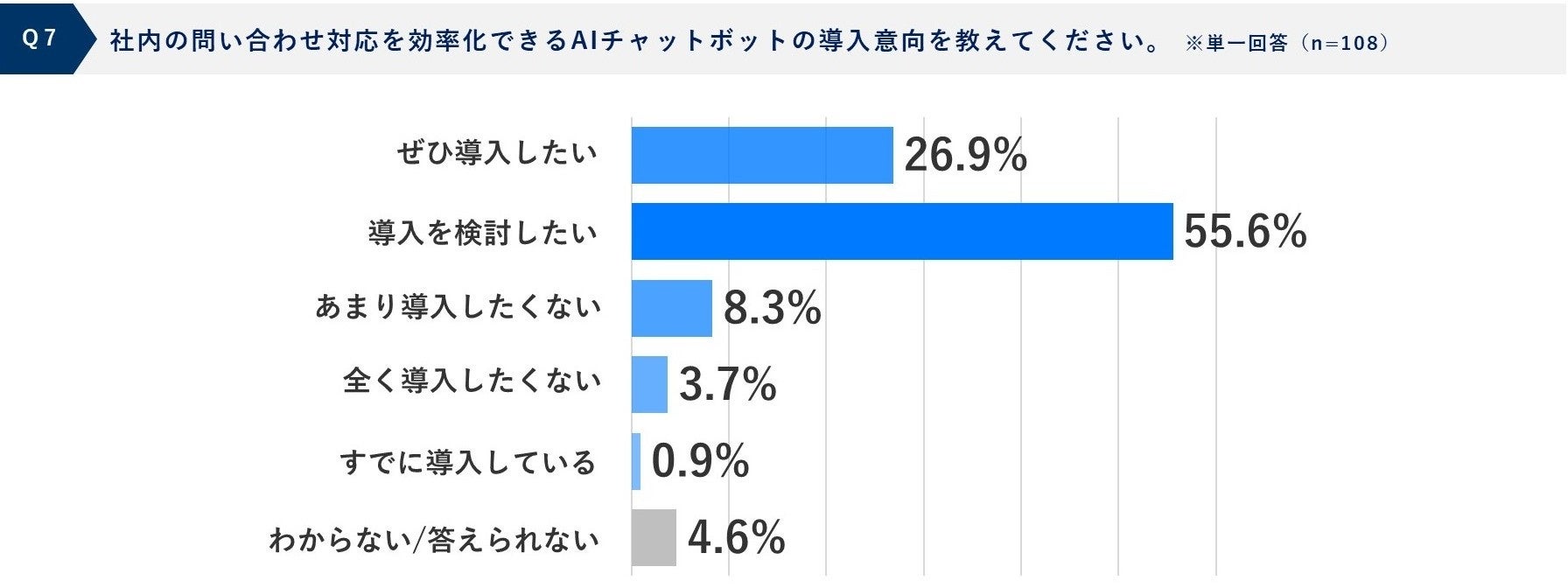 社内の問い合わせ対応を効率化するために「AIチャットボットを導入したい」と回答した担当者は82.5%でした。その理由として、最多が「戦略的業務に充てる時間を増やしたい」(67.4%)、次いで「ナレッジを蓄積・共有したい」(48.3%)という結果になりました。