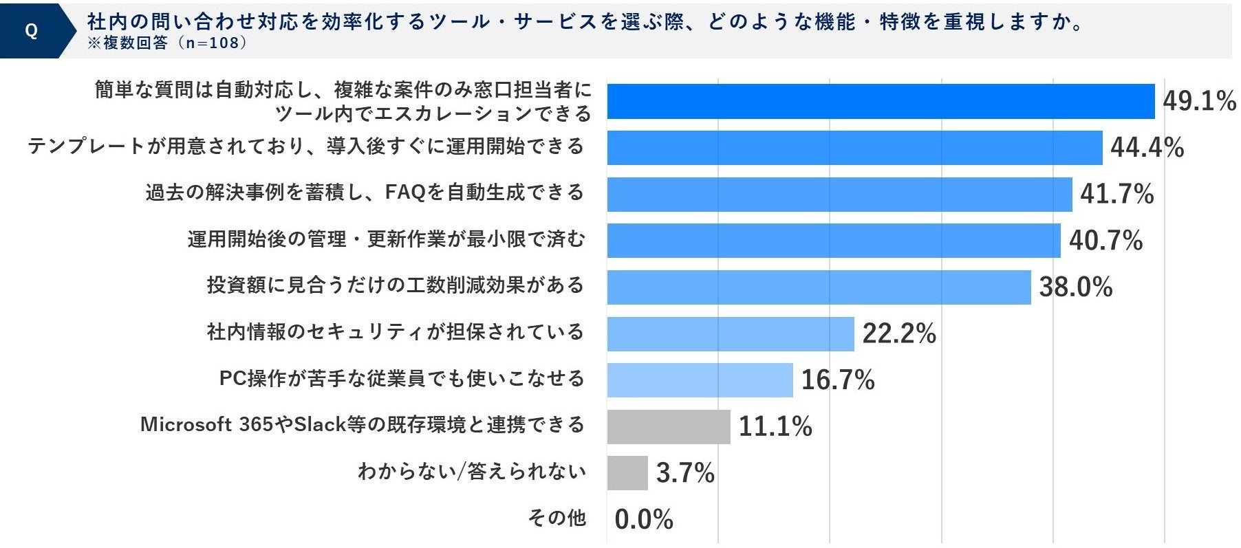 また、AIチャットボットサービスを選ぶ際に重視する機能として49.1%が「簡単な質問は自動対応し、複雑な案件のみ窓口担当者にツール内でエスカレーションできる」を挙げました。