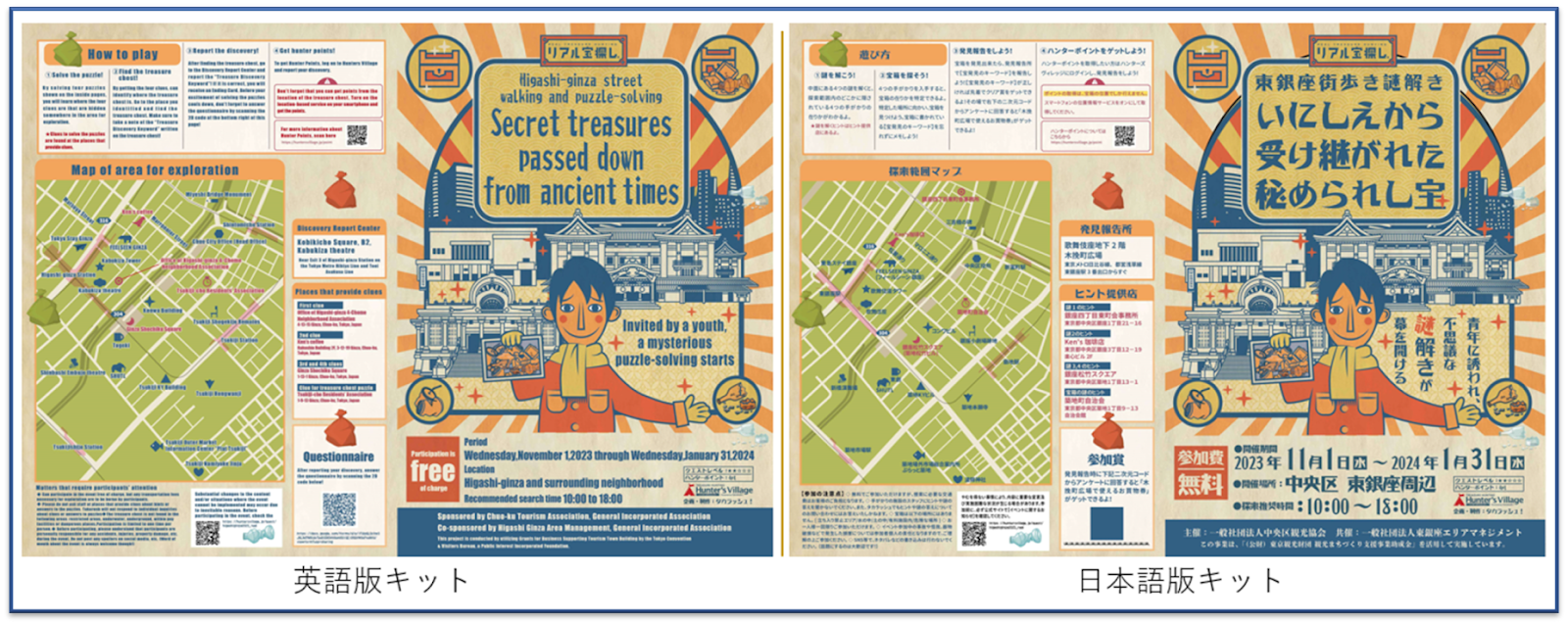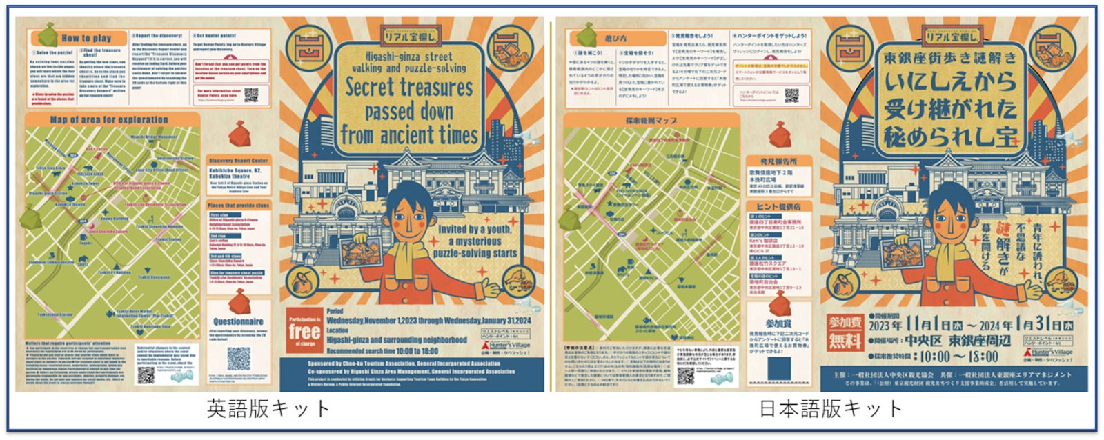 国内のみならず海外からも注目を集めている東銀座エリア。渋谷、新宿に次いで、訪問先の上位にも選ばれています。今回、外国人観光客の方にも日本の文化「宝探し」を楽しんで頂けるよう、英語版のキットを作成いたしました。外国人観光客の方にも観光をしながら宝探しや日本の文化を体験頂ける内容となっています。