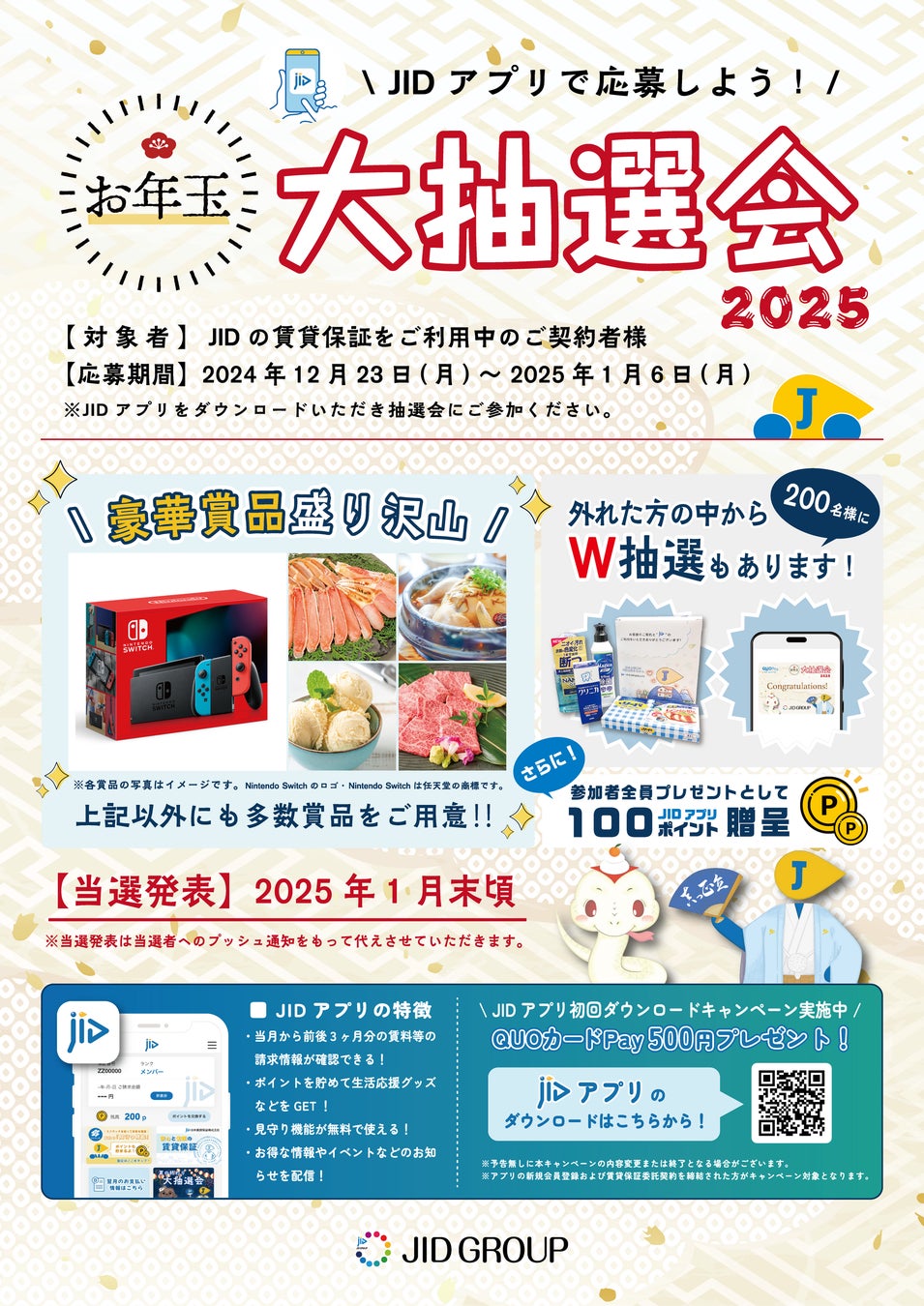 JIDの保証をご利用の契約者様(入居者様)を対象に、豪華賞品が当たる《お年玉大抽選会2025》を開催!