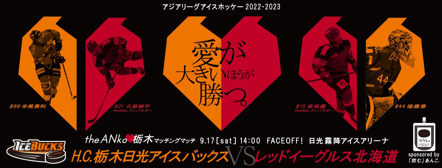 H.C.栃木日光アイスバックスは、2022年9月17日(土)開催のアジアリーグアイスホッケー2022-2023 日光シリーズ、対 レッドイーグルス北海道戦を「 theANko 栃木(ジ・アンコ LOVE とちぎ)マッチングマッチ」として開催します。