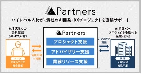 「SIGNATE Partners」は、SIGNATEコンペティションで実力が証明されているハイレベルのAI・DX人材が、企業のAI開発・DXプロジェクトを支援するサービスです。国内最大約10 万人のAI/DX人材会員を活用して、企業の最大の悩みである「AI/DX人材&知見不足」の解決を図ります。