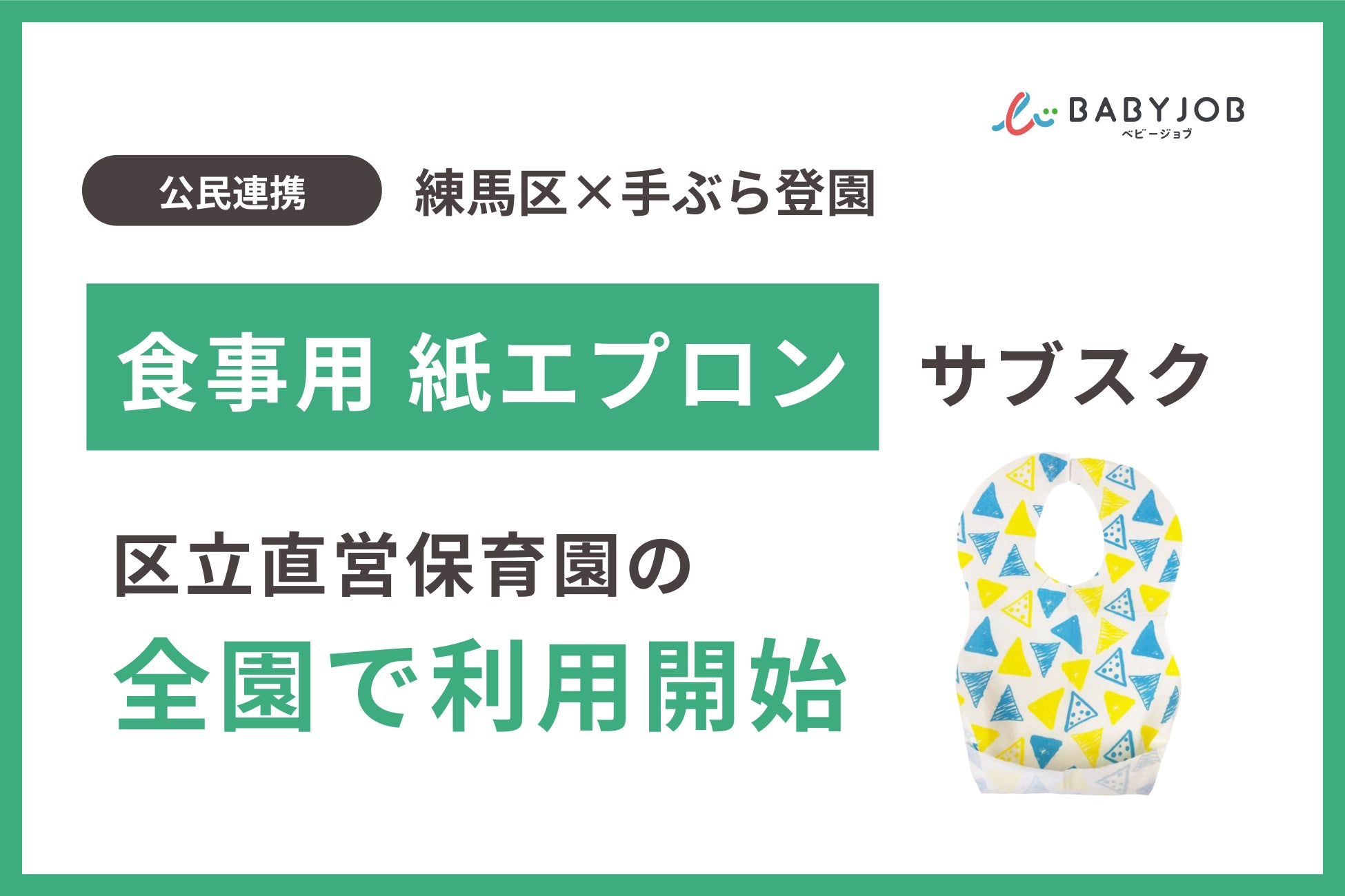 この取り組みの第一弾として、2024年4月より東京都練馬区のすべての区立直営保育園において、「手ぶら登園」の食事用紙エプロンサブスクが使えるようになります。これにより、練馬区の区立直営保育園に子どもを預けている保護者の登園準備や洗濯の負担が軽減されます。
