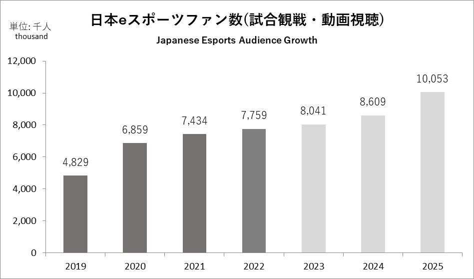 2022年の日本eスポーツファン数(試合観戦、動画視聴経験者、テレビ番組等の関連放送視聴経験者)は、およそ776万人と推定されます。オンライン視聴の定着により増えたeスポーツファンは2023年以降も堅調に伸びていくと見られ、2025年には日本のeスポーツファン数が1,000万人を超えると予測されています。