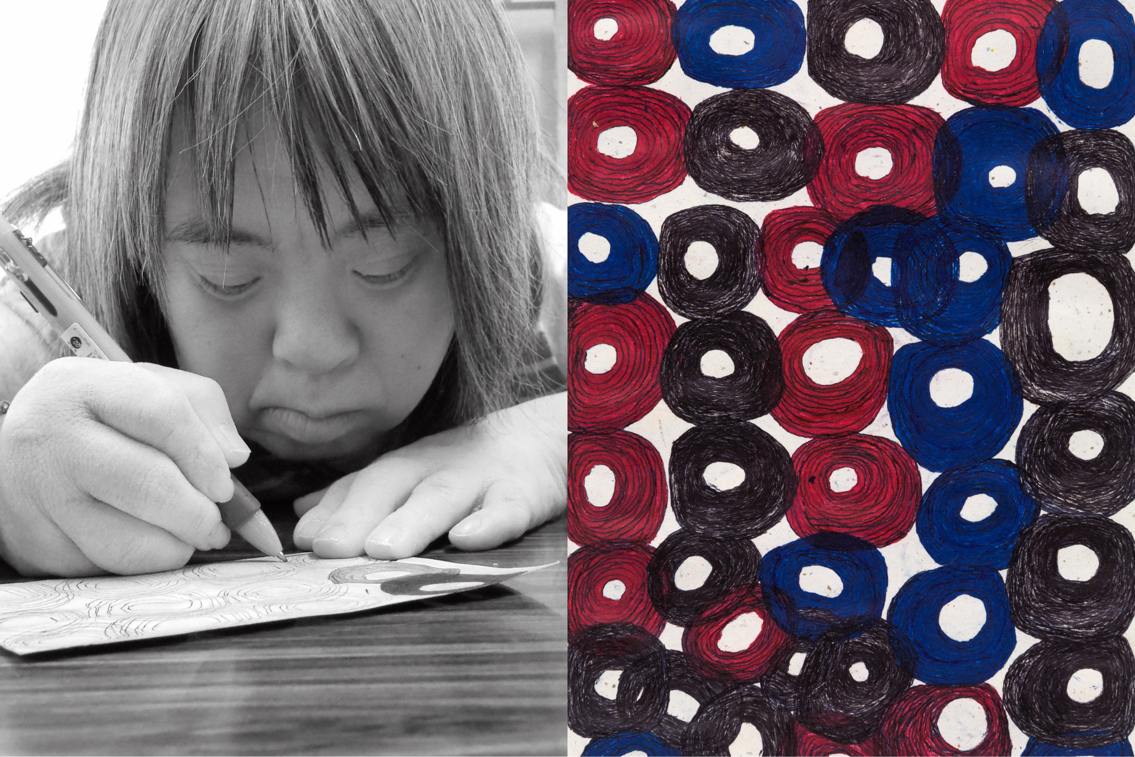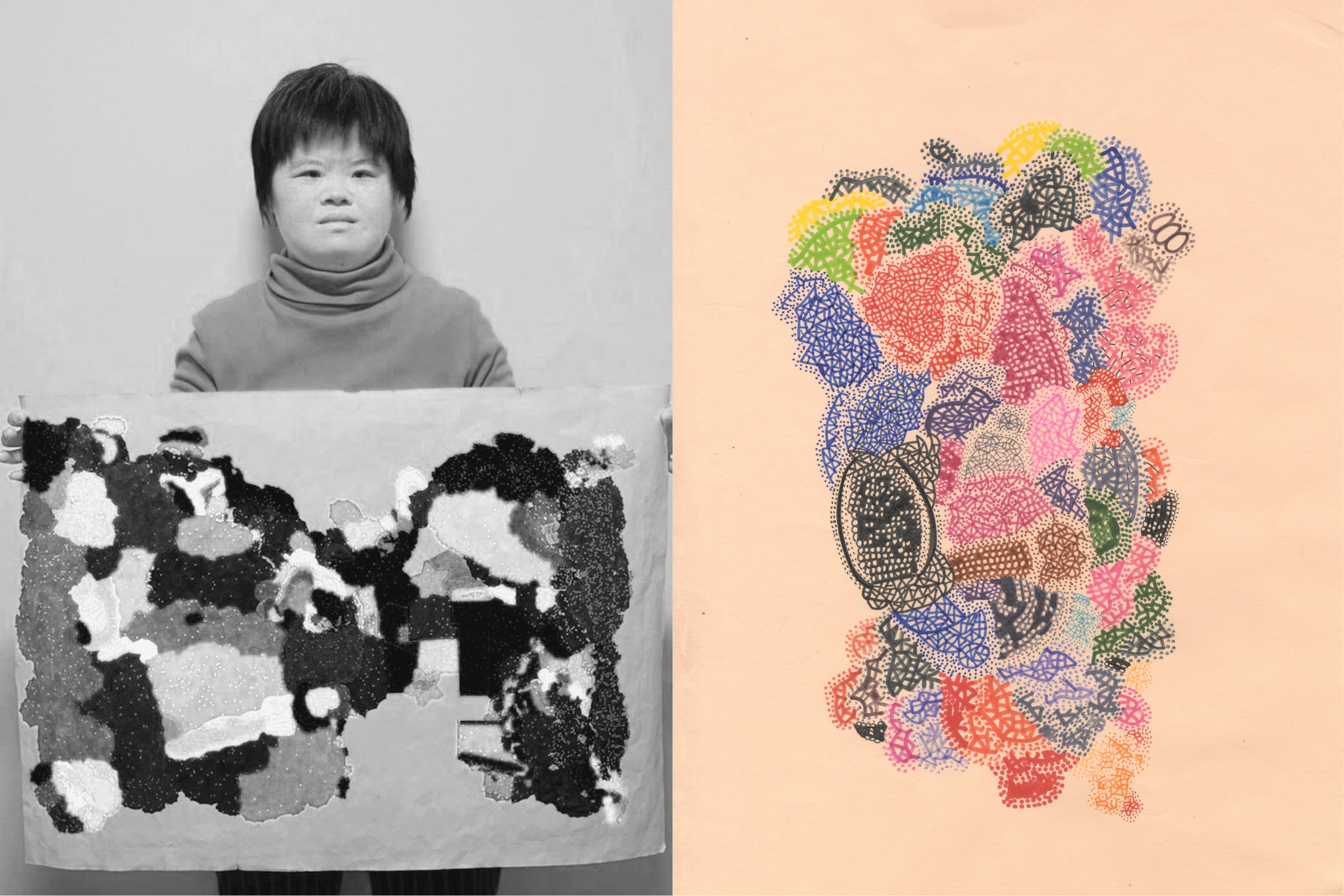 幼い頃から、机に向い集中して手指を動かす作業が好きで、モンテッソーリ教室に楽しく通っていた。折り紙が得意なところを見込まれて、ホテルでナプキン等のリネンを畳む仕事に就き、余暇として習字やリリアン、編み物をしながら過ごしていた。そんな中、ある日突然急性水腫を発症し、一時は失明も危惧されたが奇跡的に回復し、コンタクト治療によって視力を矯正できた後から、自ら手持ちの水性ペンで大胆に細やかな線画を描き始めた。彼女の作品の特徴は、独特の色彩感覚でコツコツとちいさなマルやセルを繋げ、好きなモノや想いを描く。当初は、モノクロの作品を描いていたが、次第にたくさんの色を持ち、形を変え、欠片は増殖していき徐々に現在の作風が確立されていった。高校卒業時の色紙に彼女が記した座右の銘は、「人生予期しないことが起こるからおもしろい」。現在は、作業所に通いながら、家族と夕食を囲んだ後のテーブルで、のんびりと創作活動を楽しむ毎日を過ごす。