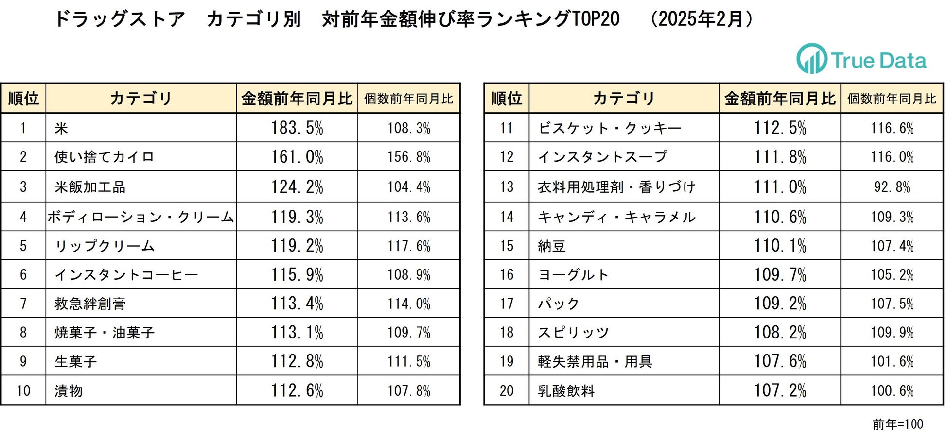~ドラッグストア、食品スーパーマーケット 対前年伸び率TOP20カテゴリを発表【 2025年2月 】~