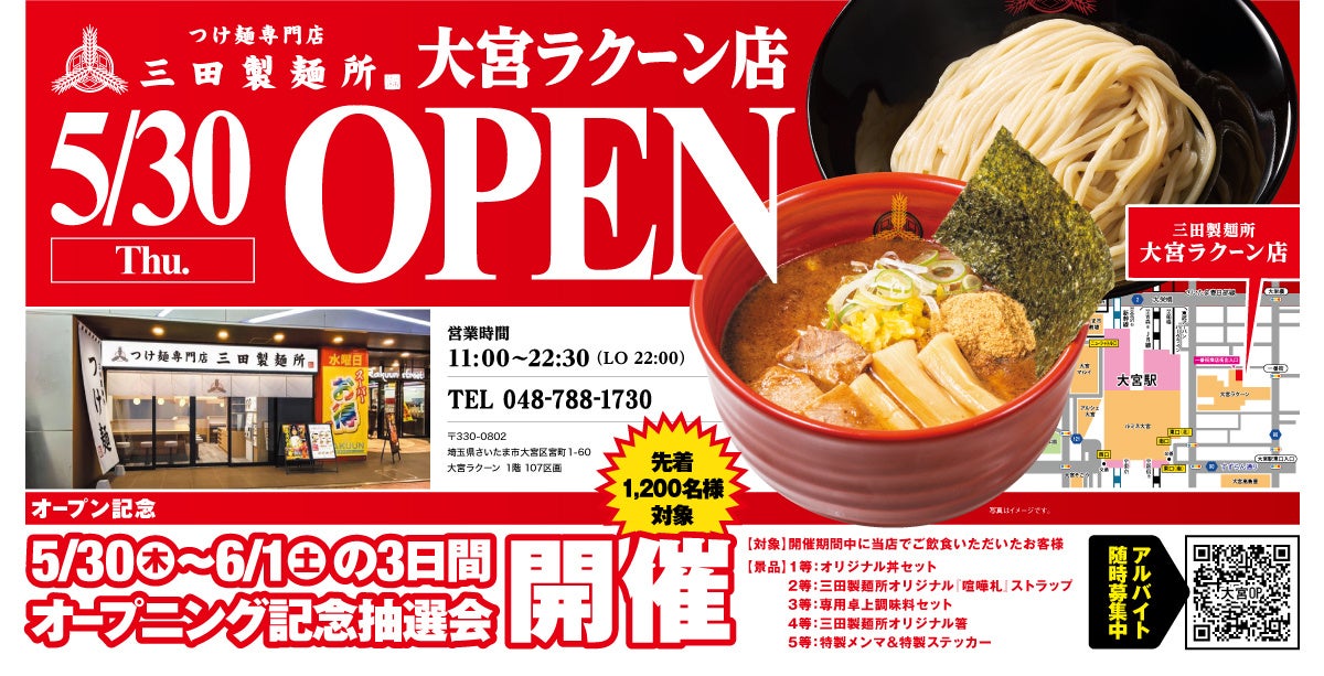 【三田製麺所】大宮ラクーン店5/30(木)NEW OPEN!オープン3日間は先着限定で“記念抽選会”を初開催!!