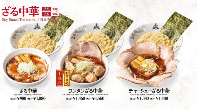 従来の三田製麺所の「濃厚豚骨魚介」とは一線を画す、さっぱり甘酸っぱい清湯スープ。透き通ったスープにのど越しの良い特製ちぢれ麺をつけて食べる、昔懐かしくも新鮮な一杯。ざる中華に店仕込み&手包みのワンタンを4つ添えたワンタンざる中華、味の染みたチャーシューをびっしりと敷き詰め、見た目・インパクトも抜群のチャーシューざる中華もございます。チャーシューはご注文を受けてから切りだすので、鮮度も抜群、しっとりとしたローストポークを思わせる味わいです。