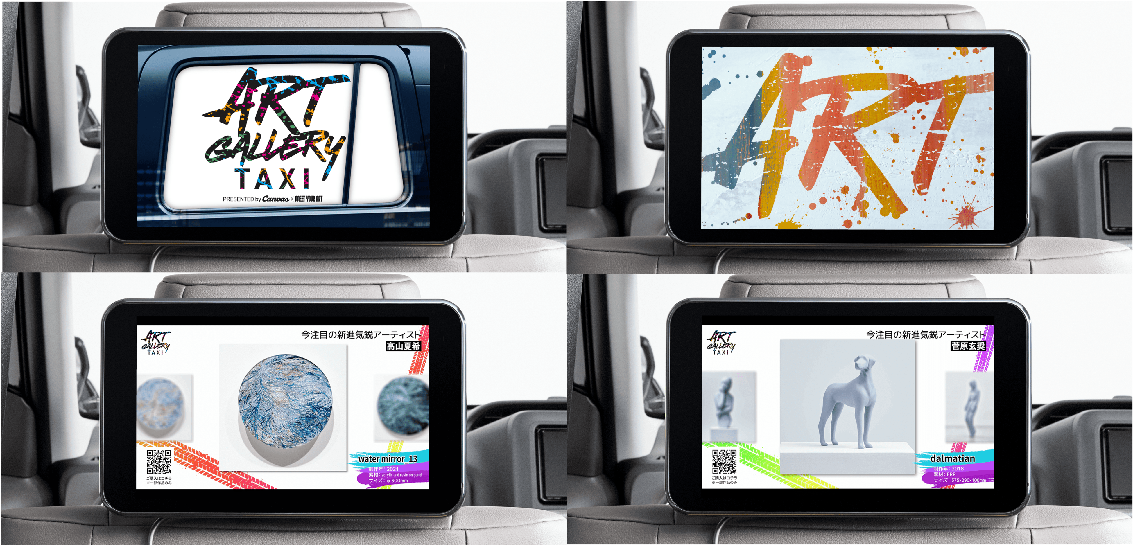 「Canvas」は、「東京の街をギャラリーに変える」をブランドコンセプトとしており、『ART GALLERY TAXI』では、タクシーを移動するギャラリーと位置付け、アーティストの作品が車窓と車内をジャックします。ギャラリーの世界観をそのままに、魅力的なアート作品をのせた『ART GALLERY TAXI』が、東京の街を駆け巡ります。アート作品は車窓のみならず、車内タブレットでも“展示“することで、まるでギャラリーにいるかのようにアート鑑賞を楽しめる空間を実現。気になった作品は、タブレットを通じてアート専門メディア「MEET YOUR ART」よりご購入(一部作品のみ)いただけます。『ART GALLERY TAXI』は、タクシーアプリ「S.RIDE」で指定配車が可能な他、車内では本プロジェクトの概要や参加ギャラリー、アーティスト情報を記載した「ART GALLERY TAXI BOOK」と『ART GALLERY TAXI』のロゴステッカーを配布します。